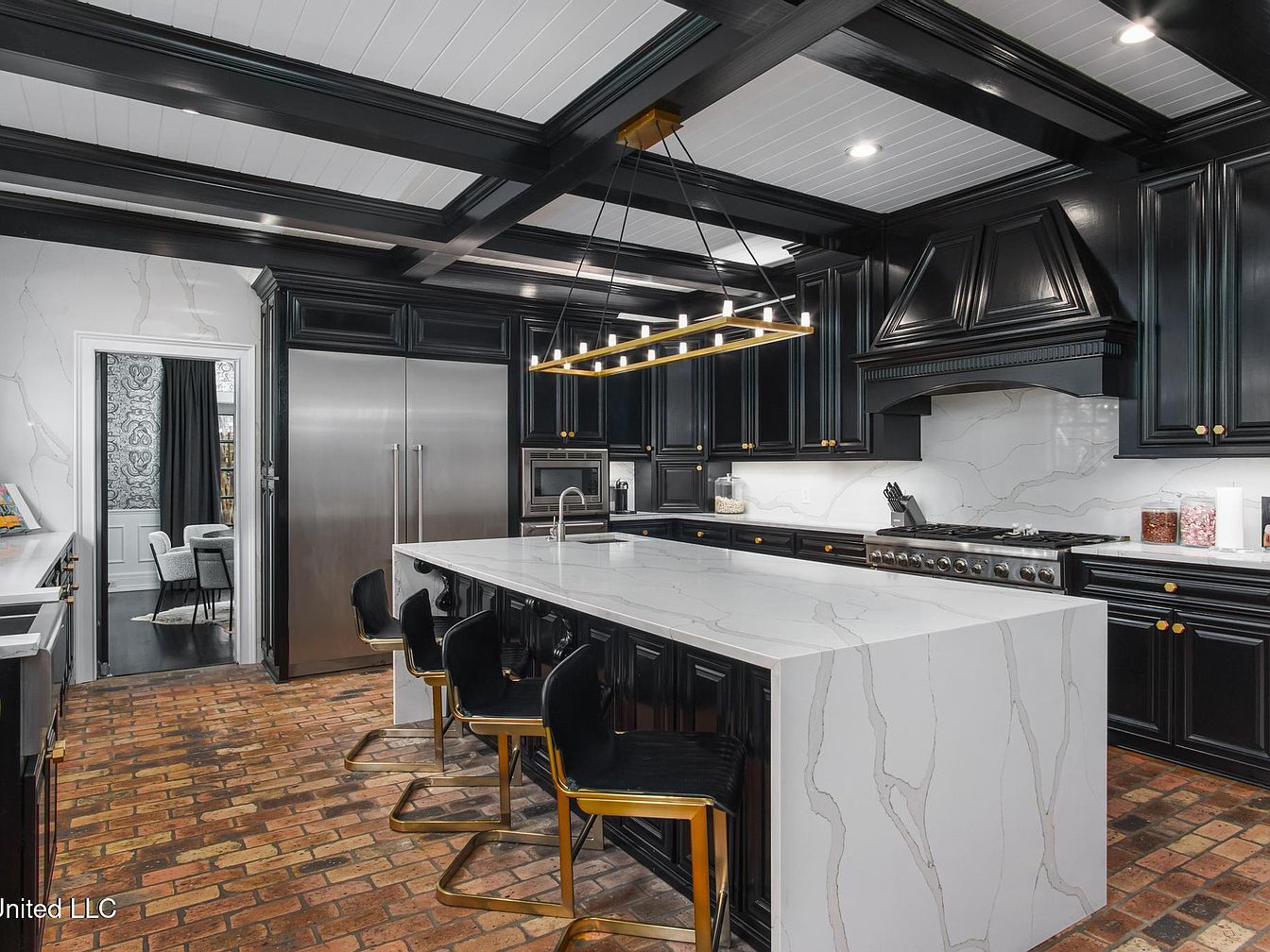 This kitchen features a striking contrast of rich black cabinetry and sleek white marble countertops. A large island with curved edges serves as the centerpiece, complemented by stylish black and gold bar stools. The rustic brick flooring adds warmth to the modern design. Above, a contemporary linear pendant light draws the eye, illuminating the impressive overhead beams that add depth to the space. Stainless steel appliances, including a double fridge and professional-grade stove, blend seamlessly with the cabinetry. The adjacent doorway hints at a cozy dining nook, showcasing the kitchen’s inviting layout.