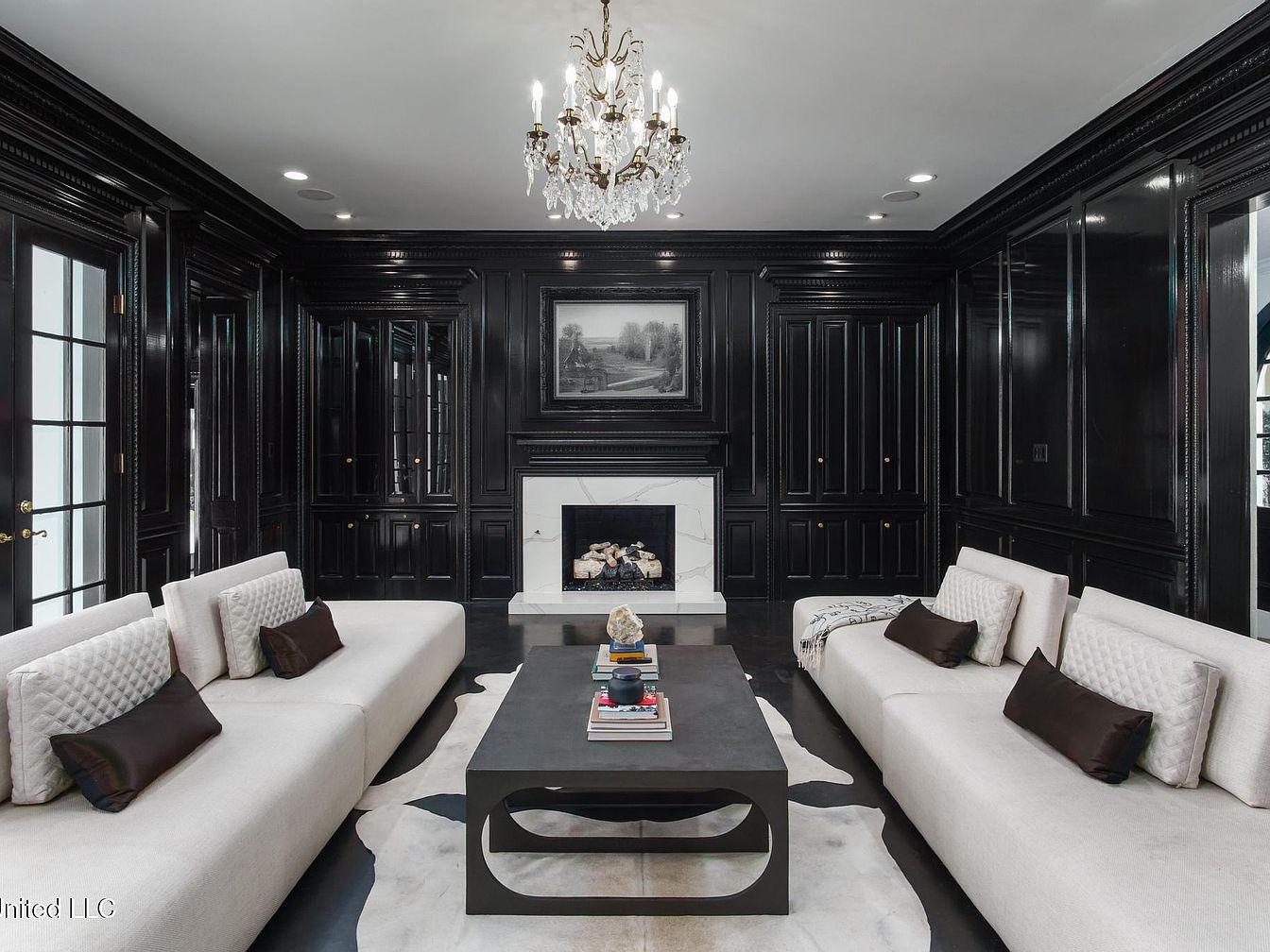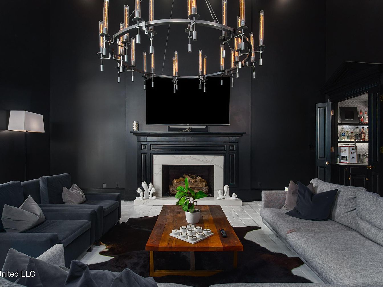 A modern living room characterized by a dramatic color palette featuring black walls that create a bold backdrop. Dark gray sectional sofas, equipped with plush pillows, are arranged around a wooden coffee table that centers the space. A sleek, contemporary chandelier hangs from the ceiling, illuminated with warm, glowing bulbs, enhancing the room’s intimate atmosphere. An elegant fireplace, framed with black marble detailing, hosts a minimalist design that complements the overall aesthetics. A small bar area is visible in a black cabinet, offering a stylish finish. The textured black cowhide rug adds warmth to the elegant, contemporary design.