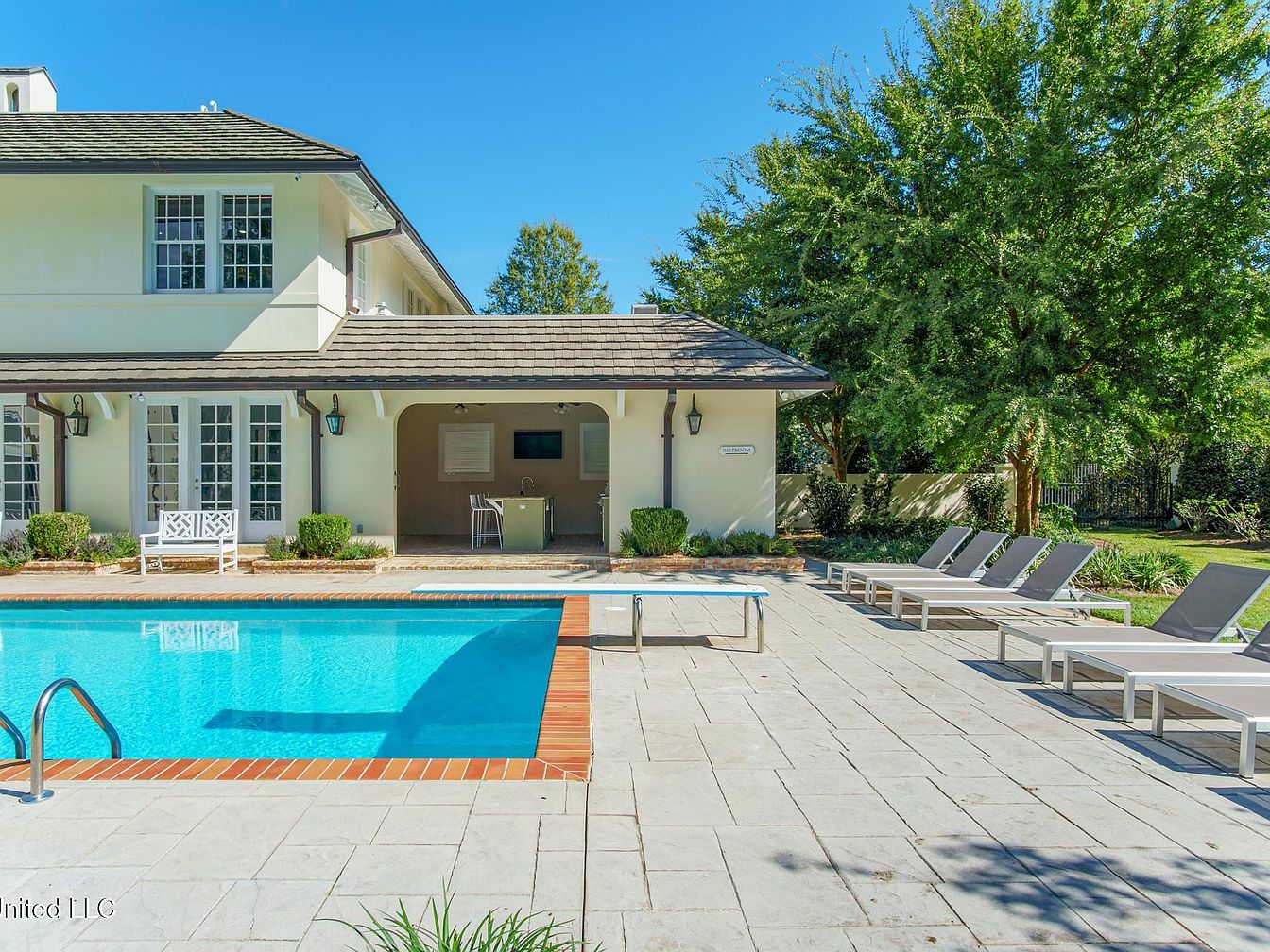 This elegantly designed poolside area features a shimmering blue pool surrounded by a stylish stone deck. The pool is framed by a rich brick coping that adds warmth to the space. Adjacent to the pool, large arched windows of a nearby room provide a view into a well-lit interior, enhancing the seamless connection between indoor and outdoor spaces. The color palette showcases soft neutral tones on the house’s exterior walls, complemented by plush green landscaping. Vintage white benches offer comfortable seating, encouraging relaxation while enjoying the sunlit ambiance and tranquil atmosphere.
