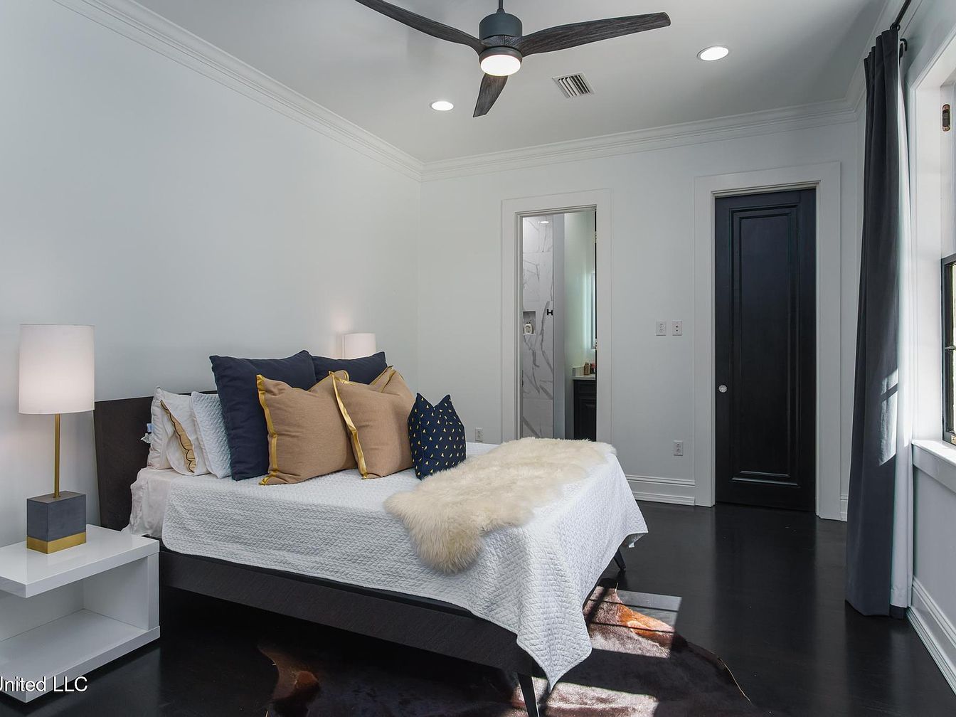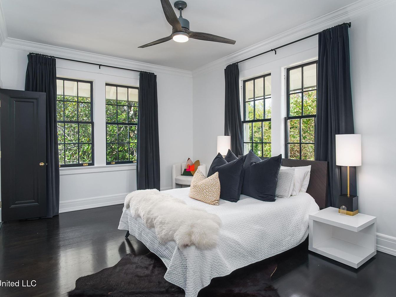 This bedroom features a serene layout with large, black-framed windows allowing natural light to stream in, surrounded by dark navy curtains. The deep wood flooring contrasts with the crisp white walls, enhancing the spacious feel. A stylish ceiling fan adds a modern touch above the cozy bed, draped with textured white and plush throws. Decorative pillows in navy and gold offer a striking focal point against the white bedding. On either side of the bed, sleek white nightstands hold contemporary lamps that illuminate the space. A dark wood door complements the room’s aesthetics, directly connecting with its elegant style.