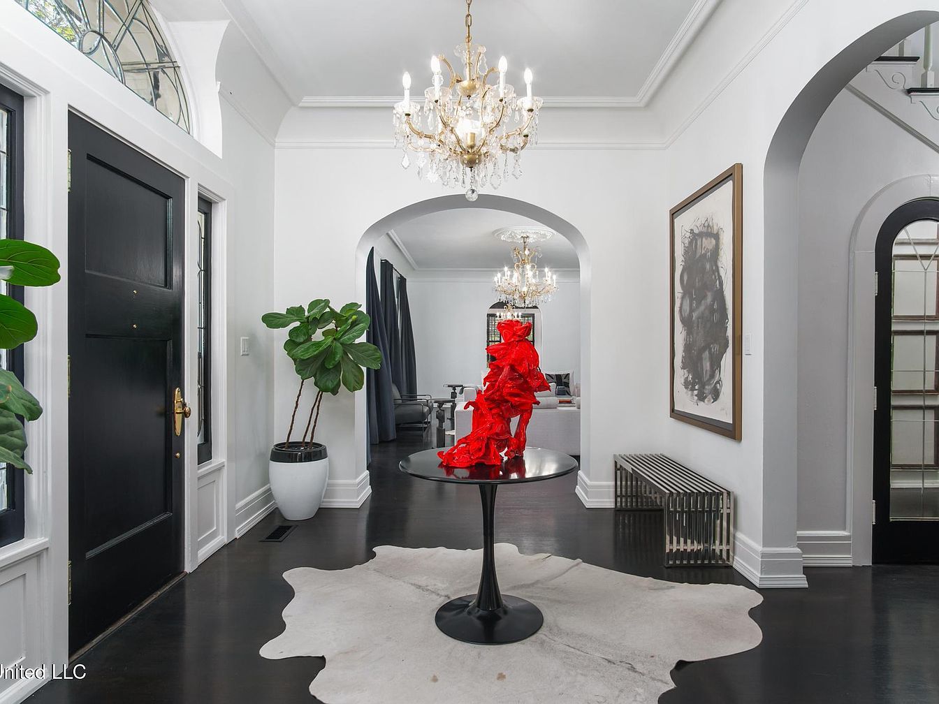 This entryway features a striking contrast of deep black doors and rich hardwood flooring. The walls are painted a crisp white, enhancing the brightness of the space. Elegantly designed chandeliers add sophistication, suspended from the detailed ceiling. A modern circular table, topped with vibrant red decor, serves as a focal point, while a plush area rug with organic shapes invites warmth. Large windows allow natural light to filter in, complemented by lush greenery in a sleek planter. The archway leads into the living area, enriching the open concept with graceful transitions between spaces.