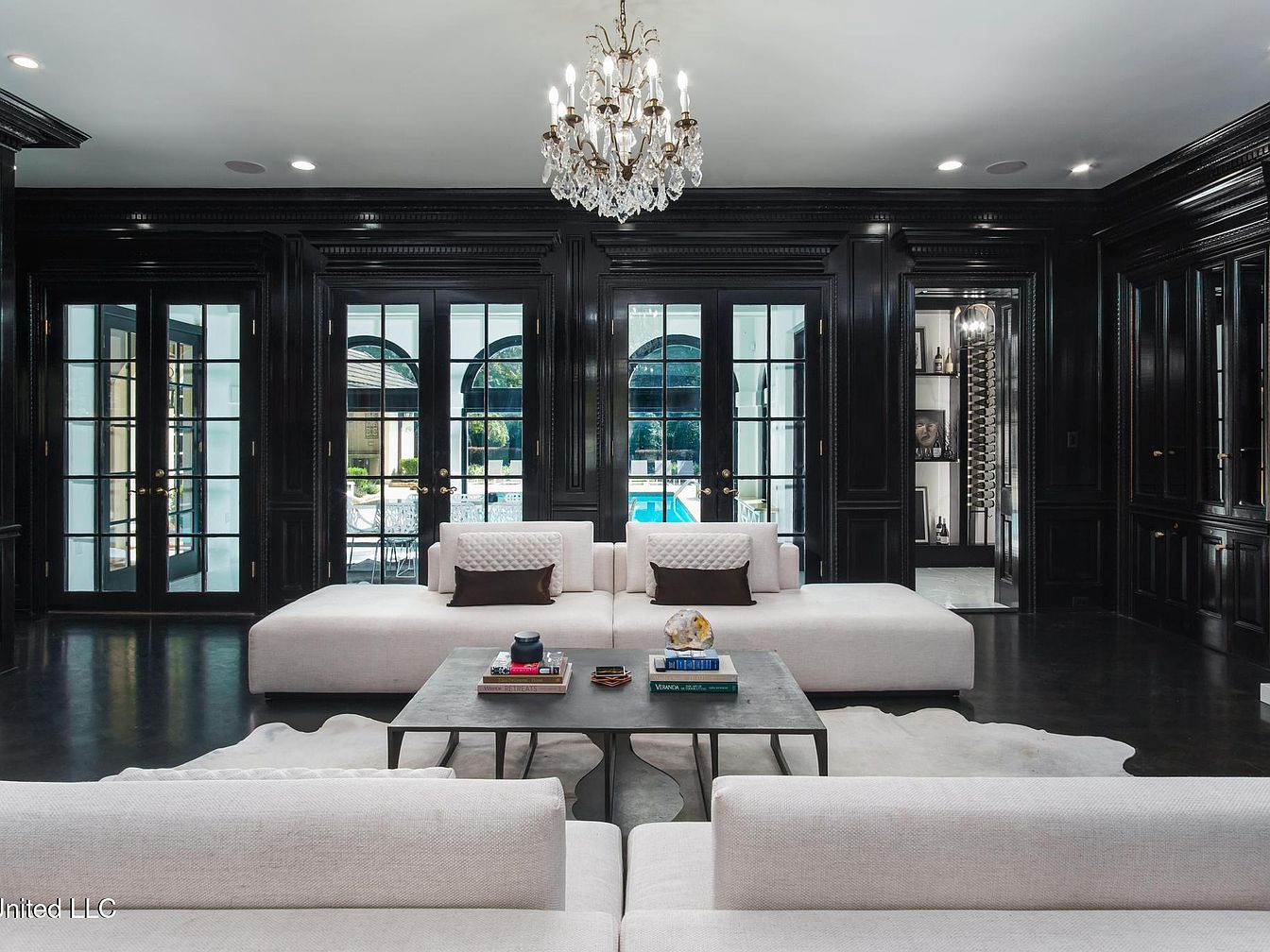 This upscale living room showcases a modern and luxurious design. The sleek black walls complement the elegant crystal chandelier overhead, enhancing the space’s sophistication. Large glass doors offer a view of the outdoor pool and allow natural light to flood the area. A contemporary sectional sofa in a soft cream fabric contrasts beautifully against the dark backdrop. A minimalist coffee table sits at the center, adorned with decorative books and a small sculpture, maintaining the room’s uncluttered aesthetic. The flooring is dark and polished, adding a touch of glamour, while subtle area rugs define the seating area.