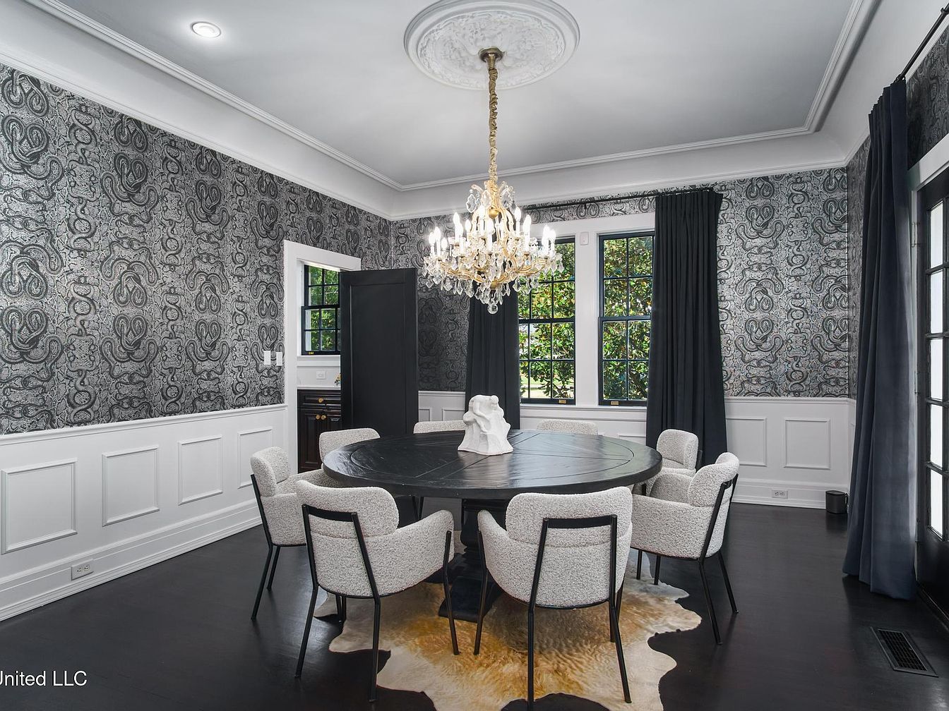 This elegant dining room features a round black table at its center, surrounded by soft, upholstered chairs in a light color. The striking black and white paisley wallpaper adds a dramatic flair, complemented by white wainscoting that enhances the room’s height. A luxurious crystal chandelier hangs from the ceiling, providing ambient lighting. Tall, dark curtains flank the large windows, allowing natural light to filter in, while a plush, animal print rug adds warmth beneath the table. Architectural details like the intricate ceiling medallion further enrich the sophisticated aesthetic of this dining area.
