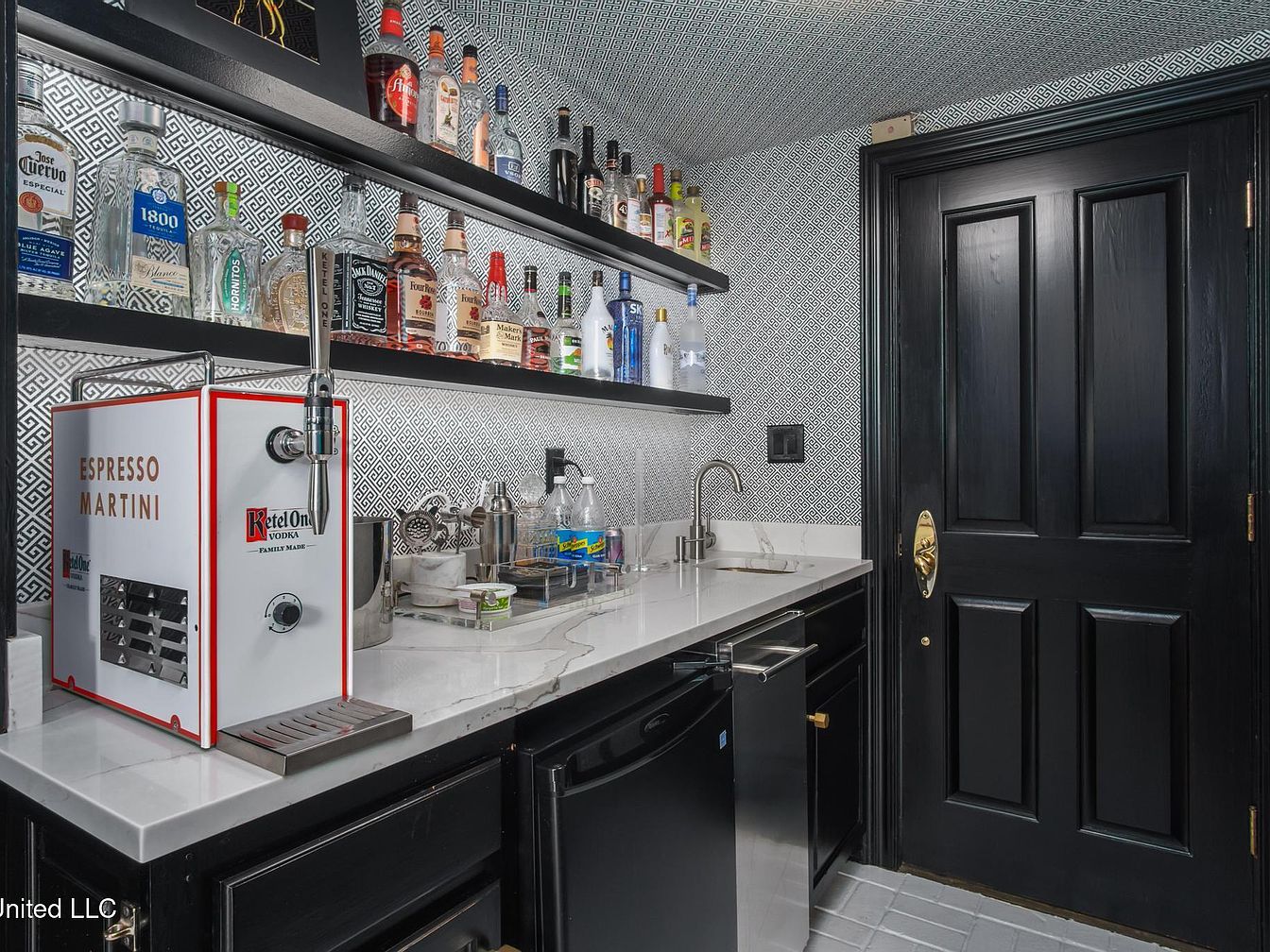 This elegant wet bar features a monochromatic color palette, emphasizing sophistication. Glossy black cabinetry contrasts with the white quartz countertop, showcasing a sleek design. Above, the shelves are lined with a variety of liquor bottles, adding vibrancy against a geometric patterned wallpaper. An Espresso Martini machine is prominently displayed, highlighting the bar’s function. A minimalist sink adds practicality without overwhelming the space. The polished floor tiles reflect the aesthetic, while the black door complements the overall theme. This area is designed for entertaining, combining modern elements with a classic touch, creating an inviting atmosphere.