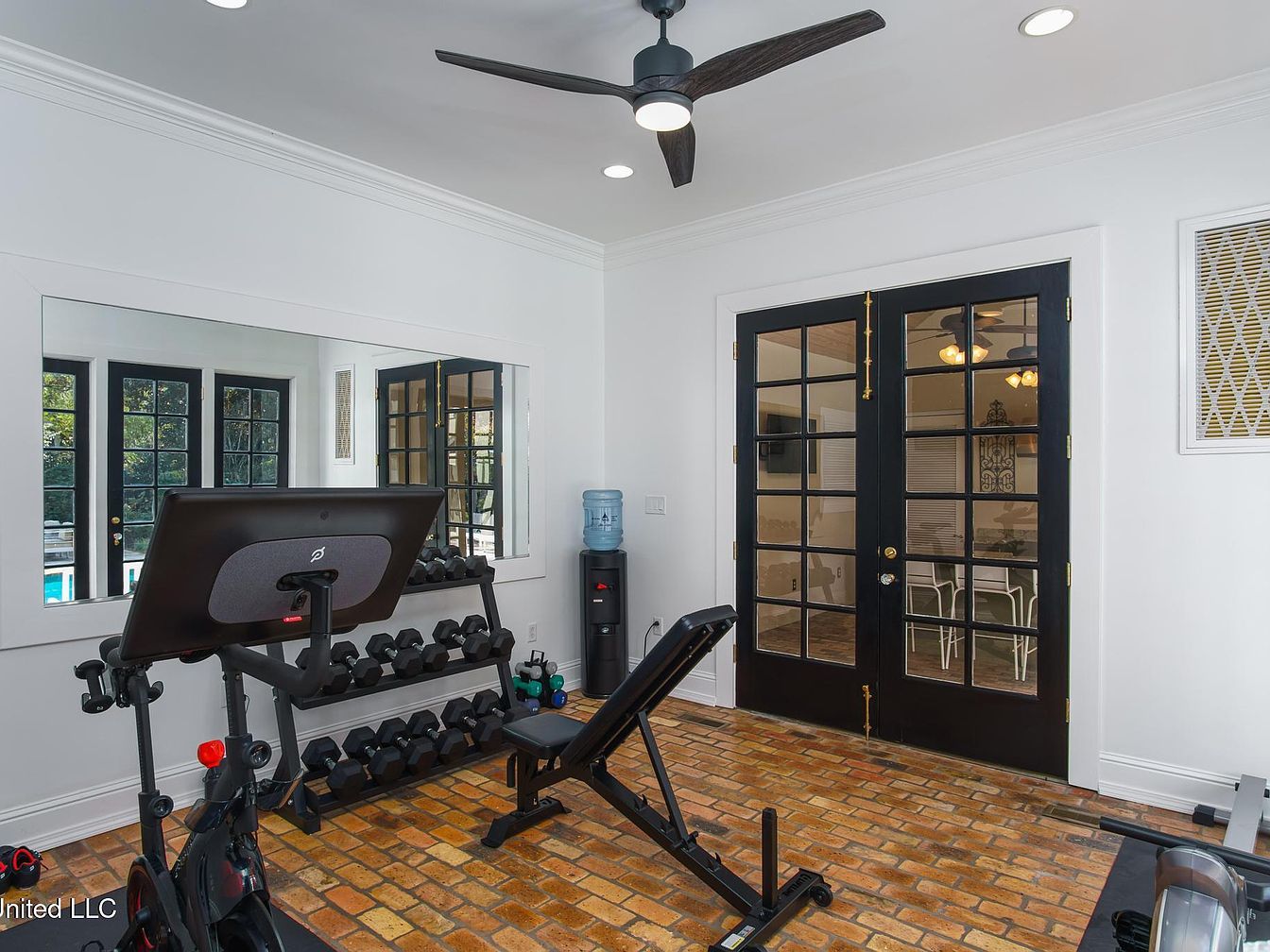 This home gym features a blend of contemporary and traditional aesthetics. The space is illuminated by recessed ceiling lights, with a stylish ceiling fan adding movement. A large mirror on one wall amplifies the light and depth of the room. Functional equipment, including a stationary bike and weight bench, sit atop rustic, warm-toned brick flooring that contrasts elegantly with the crisp, white walls. The black French doors provide a striking focal point, leading to views beyond. Accents like a water cooler and neatly arranged dumbbells enhance functionality while maintaining a clean, inviting atmosphere.