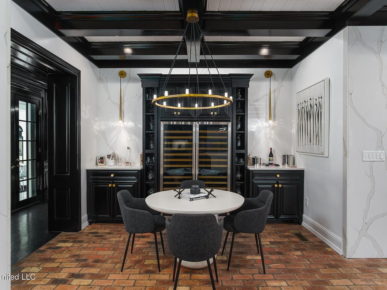 A sophisticated dining area showcasing a modern circular table surrounded by four sleek, upholstered chairs in a dark gray fabric. The table is adorned with a decorative centerpiece, enhancing the elegant aesthetic. The walls display a striking black cabinetry design that houses glassware, complemented by an elegant wine cooler. Rich, dark wood beams contrast beautifully with the white paneled ceiling, enhancing the room’s architectural appeal. The warm, rustic brick flooring adds texture and warmth, while a sleek pendant light fixture with a circular design brings a contemporary touch and illuminates the space, blending old-world charm with modern sophistication.