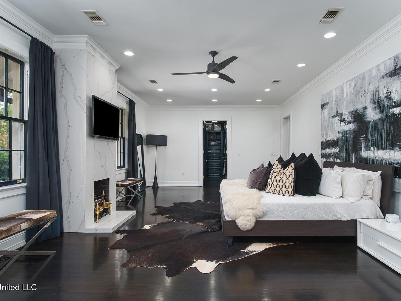 The spacious bedroom features a modern aesthetic with a neutral color palette, showcasing black, white, and shades of gray. The focal point is a low-profile platform bed adorned with an assortment of textured pillows and a plush throw. A large abstract painting enhances the wall behind the bed, adding a contemporary touch. The sleek, dark wood floors contrast with the crisp white trim and ceiling. A stylish fireplace, encased in marbled stone, complements a mounted flat-screen TV. Dark curtains frame the windows, providing privacy, while a unique cowhide rug adds warmth and character to the space.