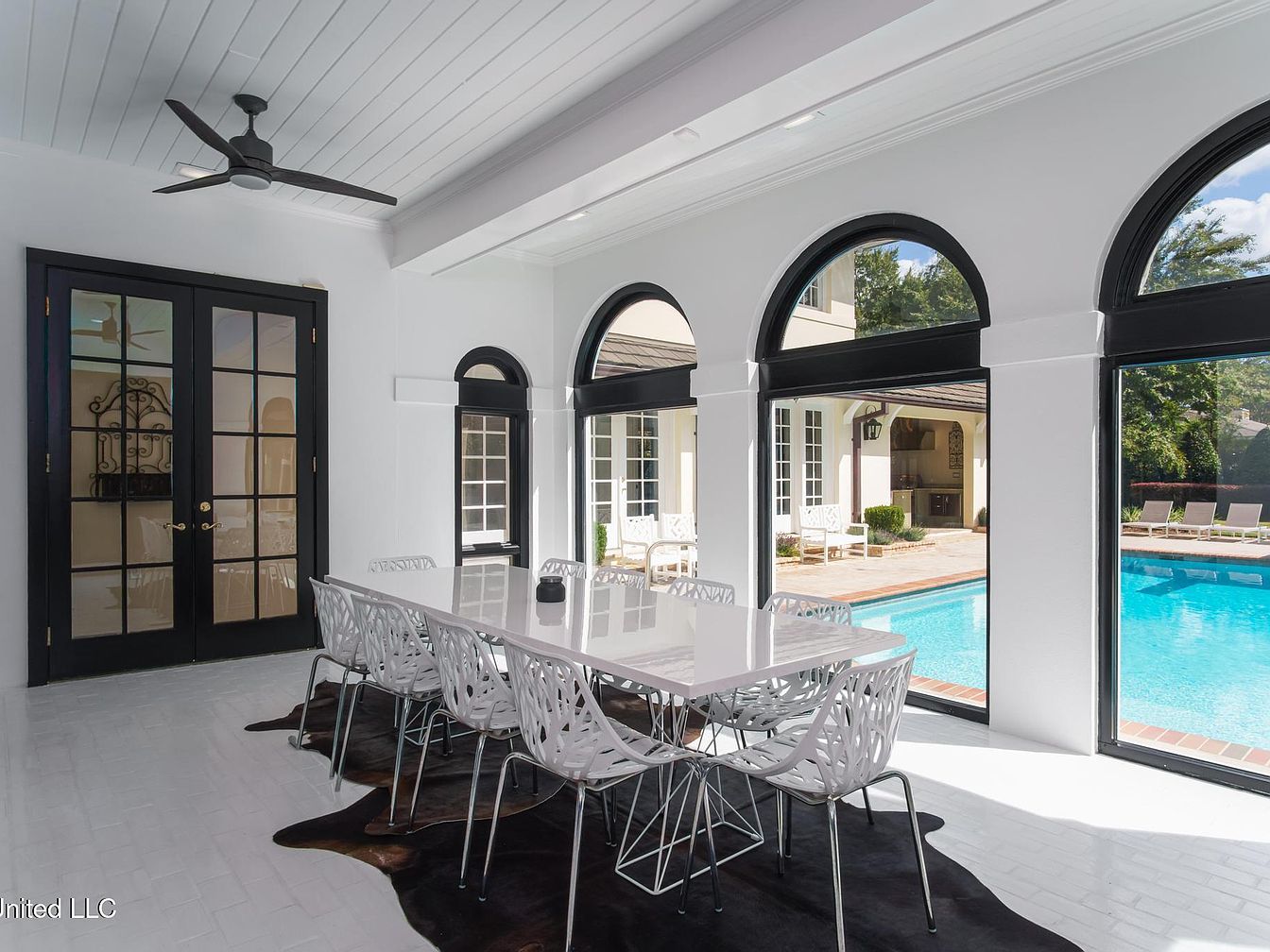 This sunroom features a modern aesthetic, characterized by a sleek white color scheme and large arched windows that allow natural light to flood the space. A long white dining table is surrounded by contemporary, sculptural chairs with intricate back designs. The flooring is made of glossy white tiles, enhancing the airy feel. A stylish black ceiling fan complements the minimalist décor, while a cowhide rug adds a touch of warmth underneath the table. Views through the expansive windows reveal a beautiful outdoor pool area, seamlessly connecting the interior with the serene outdoor landscape.