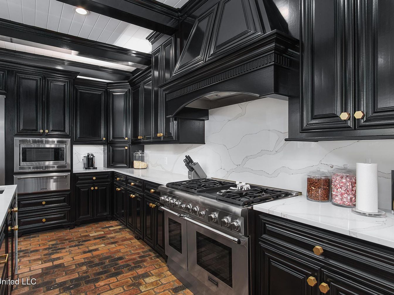 The kitchen features a modern, elegant design with striking black cabinetry that showcases intricate paneling. Each cabinet is adorned with ornate gold handles, accentuating the sophisticated aesthetic. A sleek white marble backsplash complements the countertops, while a gas stove with a stainless steel oven adds a contemporary touch. The warm, textured brick flooring contrasts beautifully with the high-gloss cabinetry and pale surfaces, creating a balanced look. Additionally, a range hood is prominently placed, enhancing the room’s functionality. Clear glass jars on the counter display colorful sweets, adding a playful element to this luxurious culinary space.