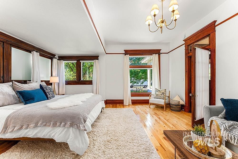 Spacious bedroom with a large, inviting bed adorned with neutral and blue accent pillows, set atop a soft cream shag rug. The room features polished hardwood floors and multiple windows framed by rich, dark wood trim, letting in plentiful natural light through sheer white curtains. A plush armchair and woven basket create a cozy sitting nook by the large window. The high ceiling is adorned with an elegant brass and white chandelier, echoing the classic, historic charm of the space. Warm woodwork throughout highlights the architectural heritage and creates a refined, welcoming atmosphere.
