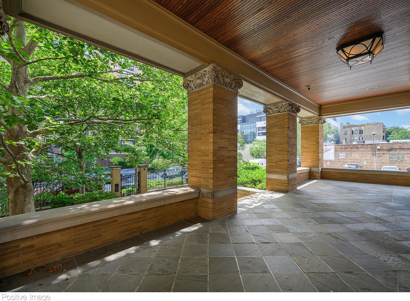 Expansive, covered porch framed by substantial brick columns with ornate capitals, adding a touch of historic elegance. The ceiling is finished in warm-toned wood planks, teamed with a geometric black-and-white light fixture. Stone tiles cover the floor, creating a cool, textured surface that’s practical and handsome. Large, built-in stone benches line the perimeter, inviting relaxation while overlooking a lush, tree-filled garden and wrought iron fencing. The porch opens widely to the surrounding urban landscape, offering both privacy with its solid railings and a welcoming entrance to the home’s exterior. Natural light filters through the leafy branches, enhancing the tranquil environment.