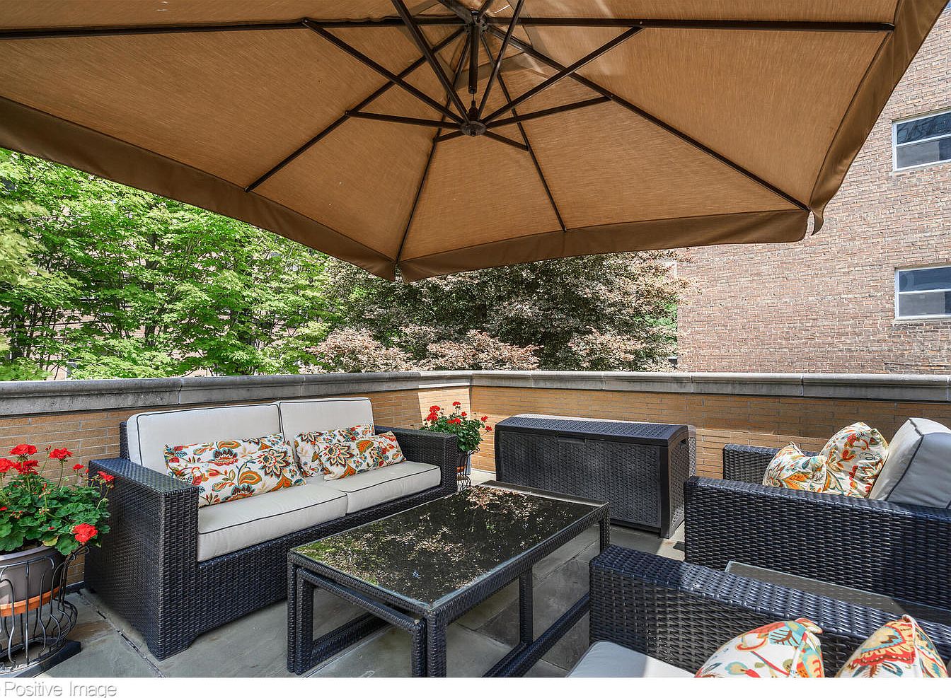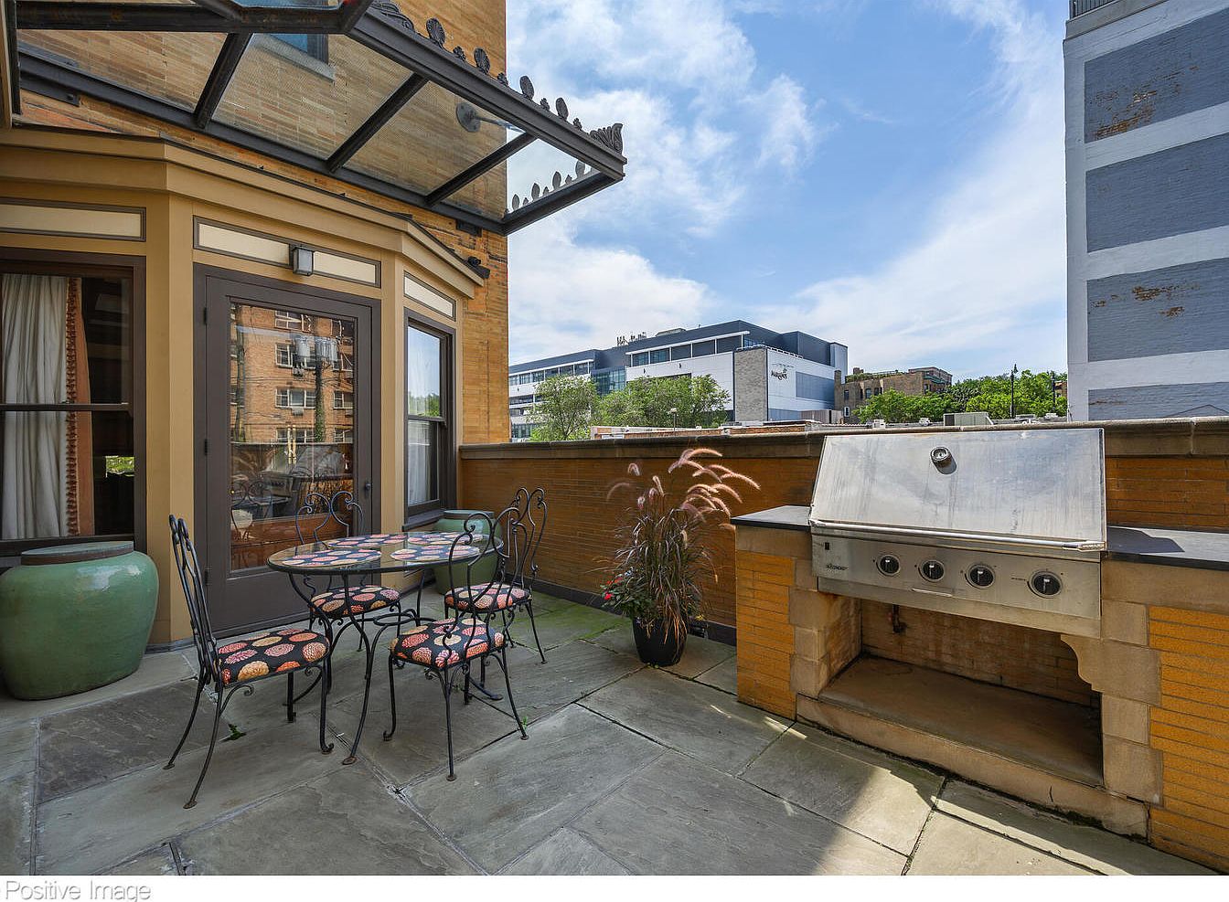 A welcoming patio features stone tile flooring and is enclosed by warm brick walls with tan trim. There’s a small round table with a mosaic-style top, surrounded by four wrought iron chairs with vibrant, patterned cushions, contributing both comfort and color to the space. A large, turquoise ceramic planter adds an additional accent to the corner. Along one wall, a built-in stainless steel grill is ready for outdoor cooking. Overhead, a glass canopy lets in natural light while offering shelter. The area combines both leisure and functionality, offering urban outdoor relaxation with nearby city views.