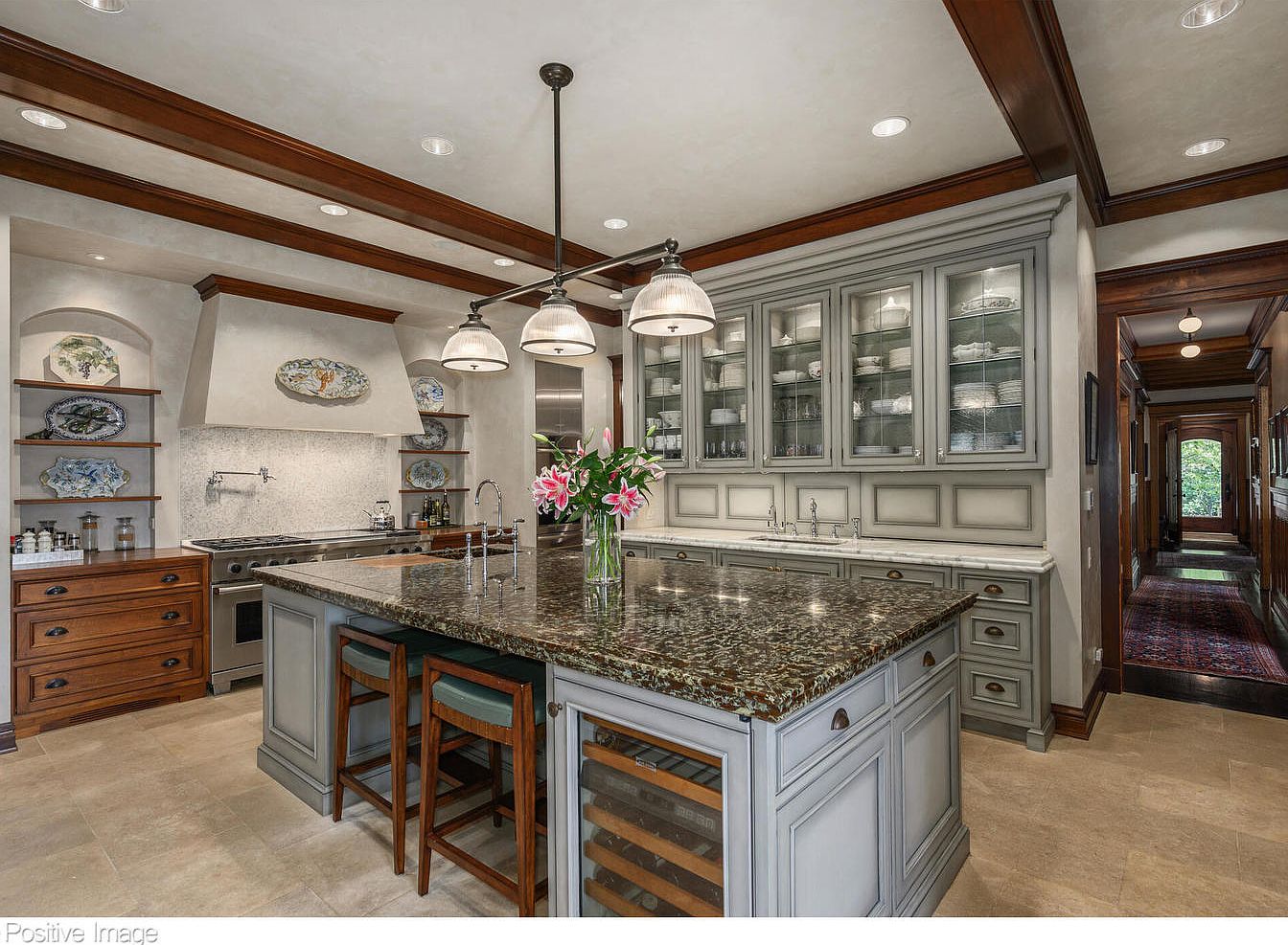 Spacious and elegant kitchen featuring a large, dark granite island with subtle green undertones, complemented by two wooden stools. The island includes a built-in wine cooler and a stainless steel sink with modern faucet. The cabinetry exhibits a soft gray finish with classic paneling and glass-front upper cabinets, showcasing fine dishware. Rich wood beams highlight the ceiling, pairing beautifully with matching drawer fronts and door frames. A row of pendant lights above the island adds a warm, inviting glow. Decorative ceramic plates stand out on open shelves, while a fresh bouquet of pink lilies brings life to the sophisticated, timeless setting.
