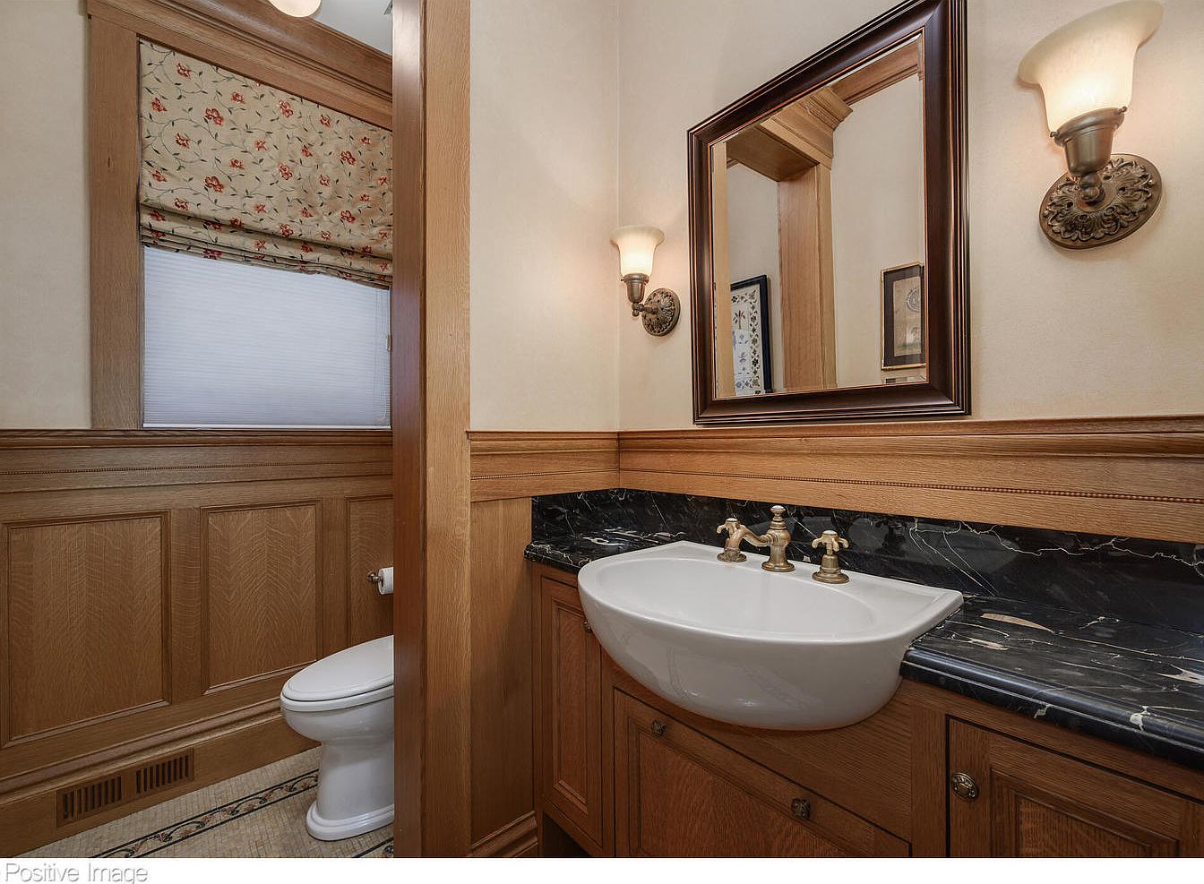 A compact powder room featuring classic wooden wainscoting and trim in rich oak tones, giving the space a warm, traditional appeal. The vanity area includes a white porcelain sink with brass fixtures set in a black marble countertop. Above the sink, a large framed mirror is flanked by two vintage-inspired wall sconces, casting a soft, warm glow. The toilet is partially separated by a wall, and a window dressed with a floral Roman shade provides privacy and natural light. The floor has a border detail, complementing the room’s timeless style and cohesive woodwork. Overall, the aesthetic is elegant and inviting.