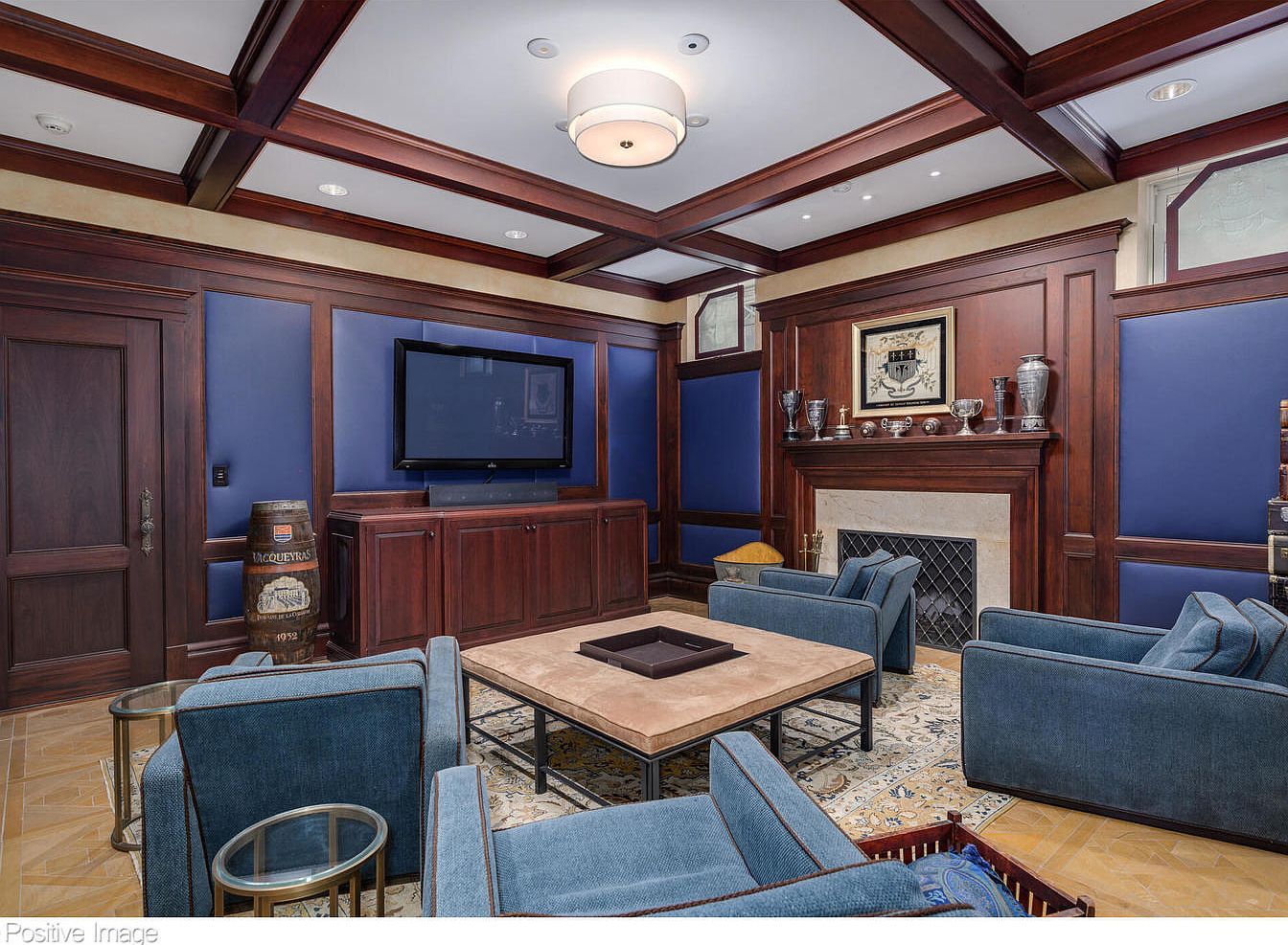 Richly paneled wood walls in deep reddish-brown hues frame this refined sitting area, accented by navy blue wall insets for a stately contrast. Four plush blue armchairs, each with clean modern lines, encircle a light-colored square coffee table with a recessed center. An ornate patterned rug complements the neutral tones of the parquet floor. The substantial fireplace features a cream surround and is topped with gleaming silver trophies and a framed crest. Large ceiling beams add architectural interest, while small glass side tables provide convenience. A wall-mounted flat-screen TV and whisky barrel add vintage charm to the relaxed, sophisticated ambiance.