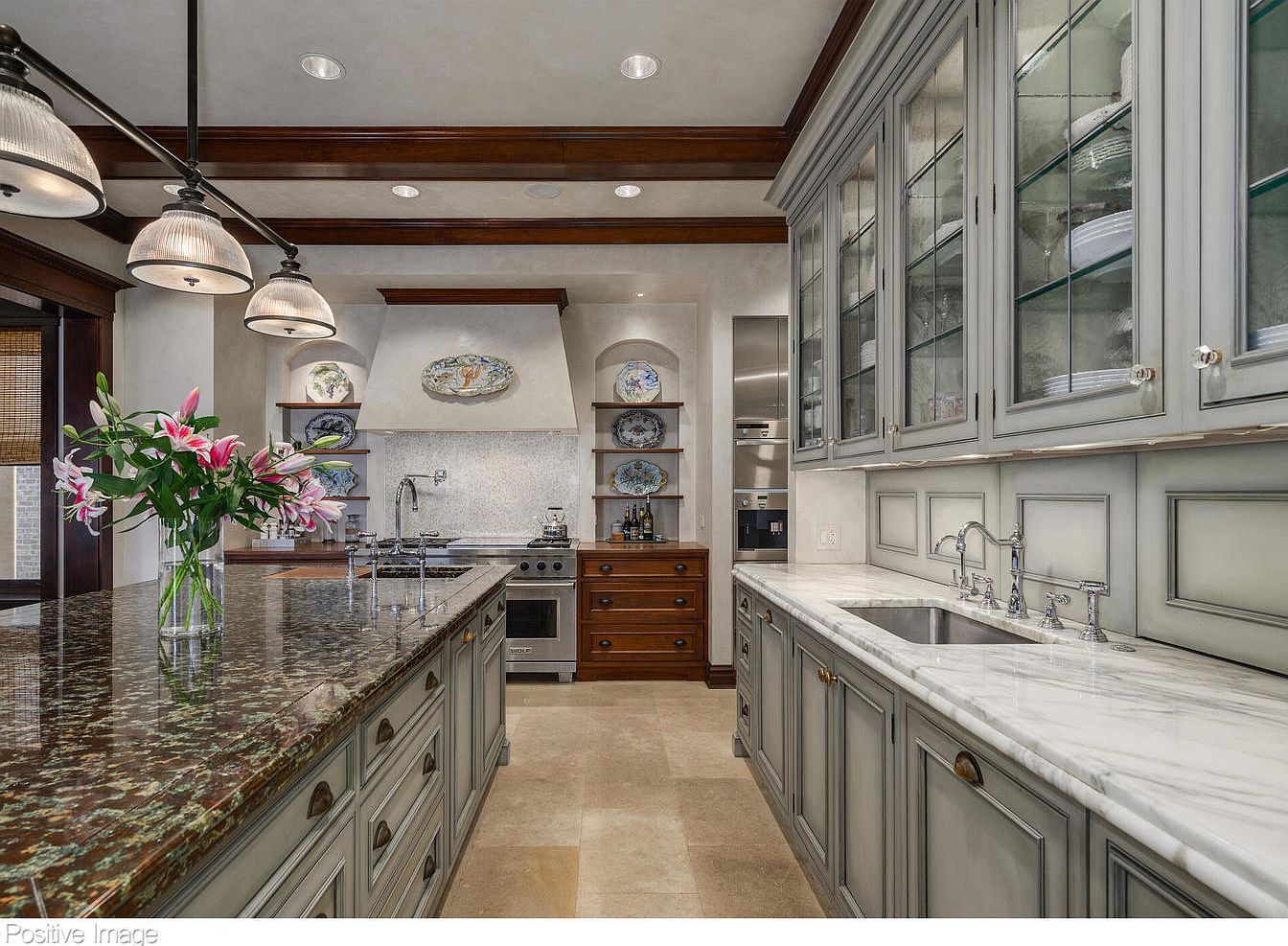 A spacious, elegant kitchen features a large central island with a dark, veined granite countertop and traditional paneled cabinetry in a muted, sage-green color. Overhead, glass pendant lights hang from a metal fixture, providing soft illumination. The perimeter countertops are a light marble, complementing glass-fronted upper cabinets filled with white dishes. Stainless steel appliances and a large range are framed by a decorative white tile backsplash and open shelving showcasing colorful ceramic plates. Warm wood accents appear in exposed ceiling beams and shelving, while a vase of fresh pink lilies adds a pop of color to the classic, refined space.