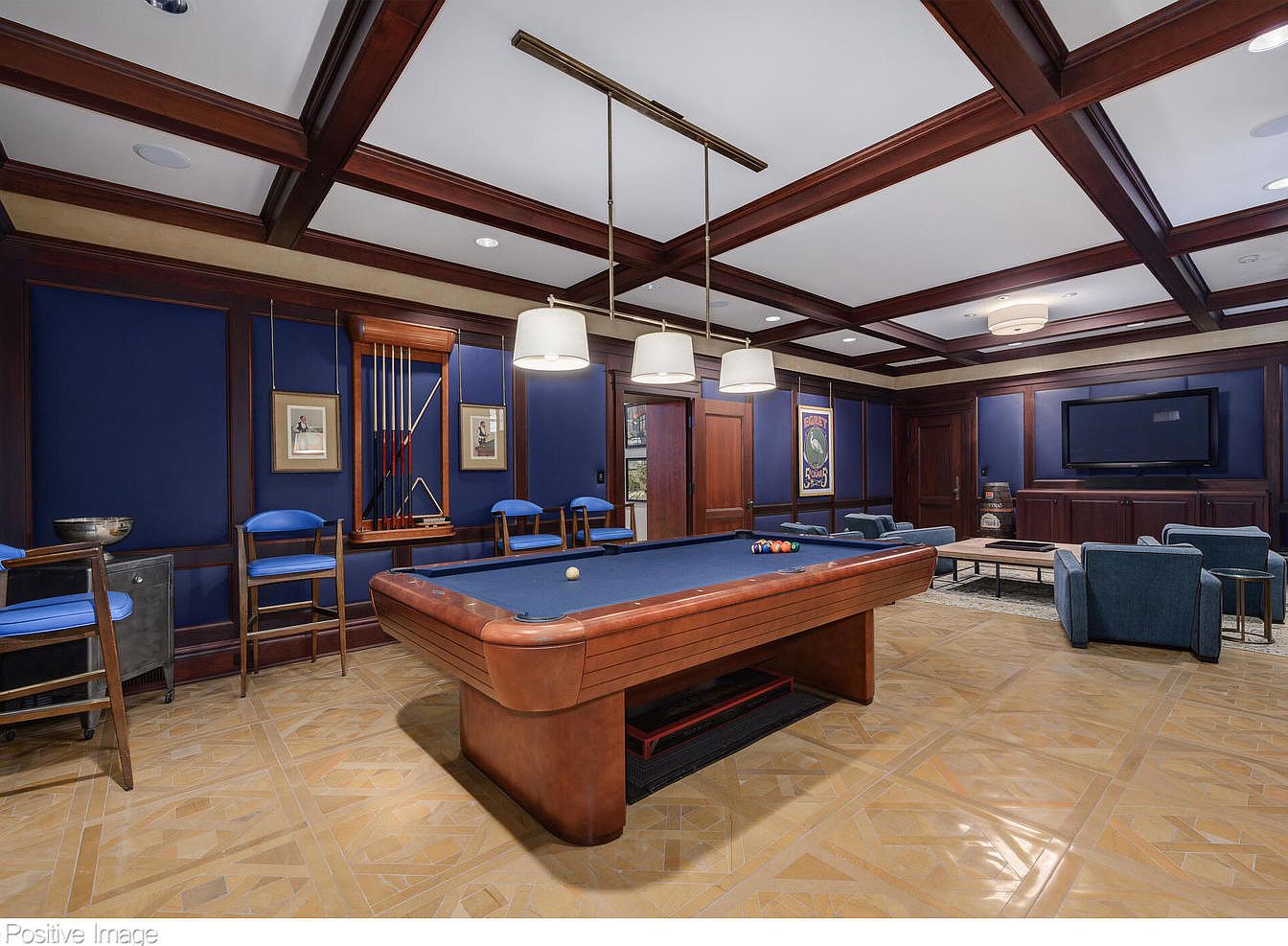 A spacious recreation room centers around a luxurious pool table with a rich wooden frame and deep blue felt that harmonizes with the surrounding paneled walls in navy blue. Wood ceiling beams and trim add warmth and character, complementing the light, patterned parquet floor. A trio of pendant lights hangs directly above the table, casting focused illumination. Built-in wooden cabinetry and paneling house a wall-mounted television, while plush blue armchairs and a low coffee table create a cozy lounge area. Decorative artwork, framed prints, and a rack of pool cues are displayed on the walls, enhancing the sophisticated, club-like ambiance.