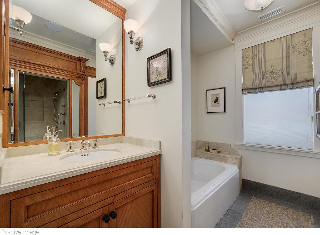 A classic bathroom with a warm, inviting atmosphere featuring a wooden vanity topped with a light stone countertop and chrome fixtures. Above the vanity is a large mirror framed in matching wood, flanked by two elegant wall sconces. The room is painted in soft neutral tones, with simple framed art on the walls for a touch of sophistication. To the right, a white soaking tub is surrounded by more stone and nestled beneath a window dressed in a light beige Roman shade decorated with a subtle floral pattern. The floor features small square mosaic tiles adding visual interest.