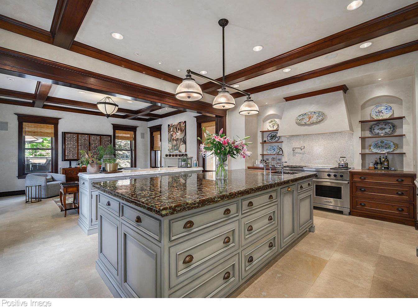 A spacious, elegant kitchen features a large central island with a dark, glossy stone countertop and light gray paneled cabinetry with bronze hardware. Overhead, pendant lights with fluted glass shades hang from a coffered ceiling, accented with exposed dark wood beams. The room is bathed in natural light from several large windows with woven wood shades. Ornately arranged open shelving around the stove displays decorative plates, and wood cabinetry flanks the stainless steel appliances. Soft cream-colored walls and beige stone flooring create a warm, inviting backdrop, while fresh flowers and potted plants add a touch of vibrancy and life to the space.
