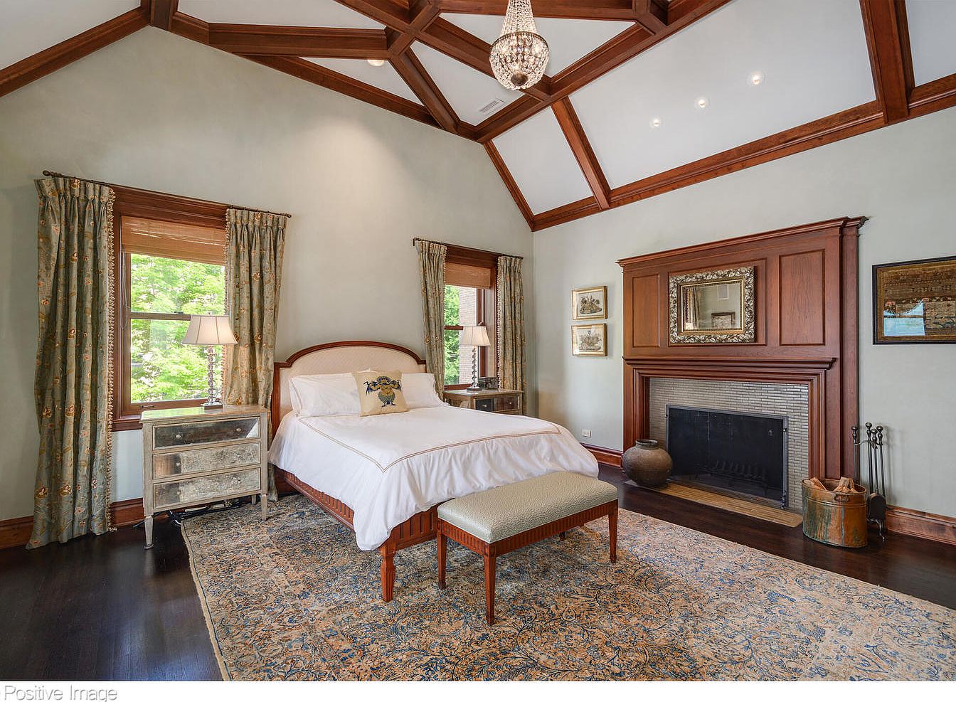 Spacious bedroom featuring a vaulted ceiling with exposed wooden beams and a sparkling chandelier as the centerpiece. The walls are a soft, muted sage, complemented by richly toned woodwork framing the fireplace and windows. A large, intricately patterned area rug covers the dark hardwood floors, adding warmth to the room. The bed is dressed in crisp white linens and has a decorative pillow, sitting between two mirrored nightstands with matching lamps. Heavy draped curtains with subtle patterns frame the windows, allowing natural light to flow in. Above the wooden mantelpiece, an ornate mirror reflects brightness throughout the serene, elegant space.