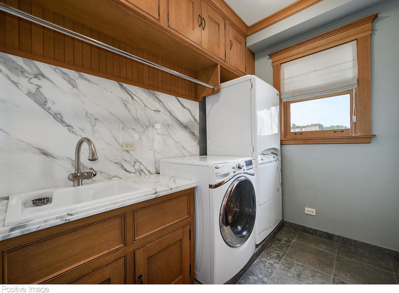 A compact laundry room with a clean, functional layout featuring a side-by-side washer and dryer in crisp white. The backsplash and countertop are covered in luxurious white marble with bold gray veining, extending along the wall and enhancing the space’s brightness. Above the sink and counter are natural wood cabinets with matching trim, providing ample storage and a classic touch. An open shelf with a hanging bar adds convenience for drying or sorting. The large window, framed in warm wood, allows natural light to flood the room, while the slate gray floor tiles ground the overall neutral and elegant color scheme.