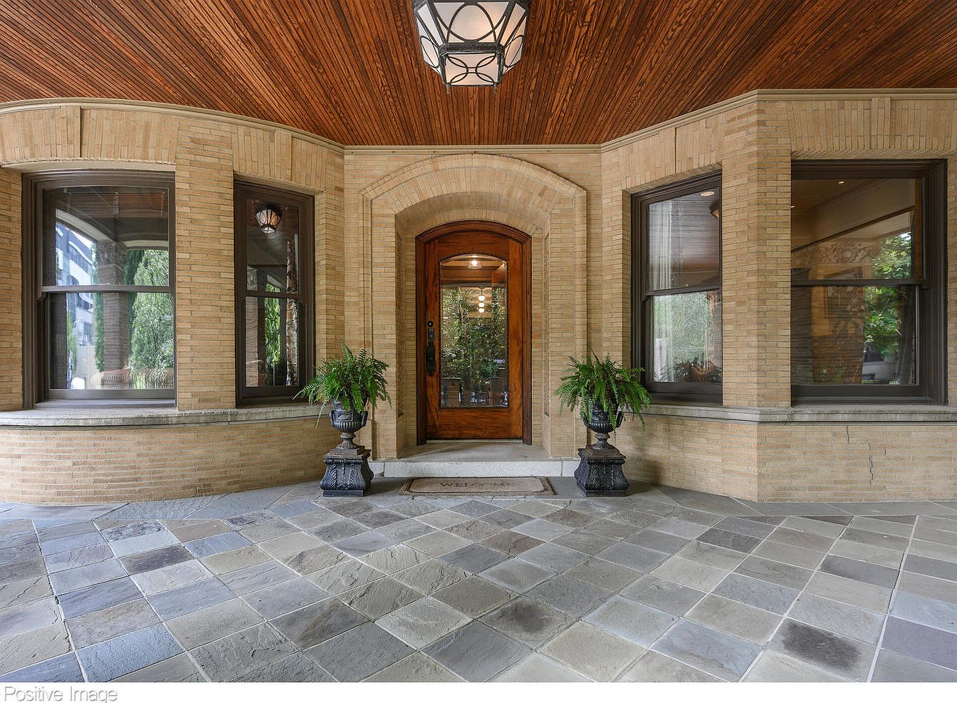 A spacious, welcoming front entryway features a stately wooden door with a glass panel, framed by gently curved brick walls in a warm beige tone. Two large windows flank the doorway, allowing natural light to spill into the adjacent rooms. The entry porch is paved with square gray stone tiles arranged in a diagonal pattern, adding sophistication and durability. Elegant urn planters with lush green ferns stand on either side of the door, providing a touch of greenery. Overhead, a rich wood-paneled ceiling with a geometric hanging lantern creates depth and accentuates the home’s historic charm.
