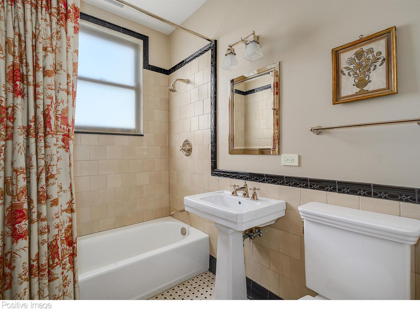 A bathroom features classic neutral tiles in tan with black trim framing the upper and lower perimeters. A frosted window allows diffused natural light above a white bathtub, complemented by a gold-toned, vintage-style shower fixture. The sink is a pedestal style with brass hardware, matching the fixtures throughout the space. Above the sink is a bevel-edged mirror with a pair of geometric wall sconces. A toile-patterned shower curtain in red and cream adds a traditional accent, and the tiled floor carries a small-scale black and white motif. A framed botanical print and towel bar contribute to the warm, period-appropriate charm.
