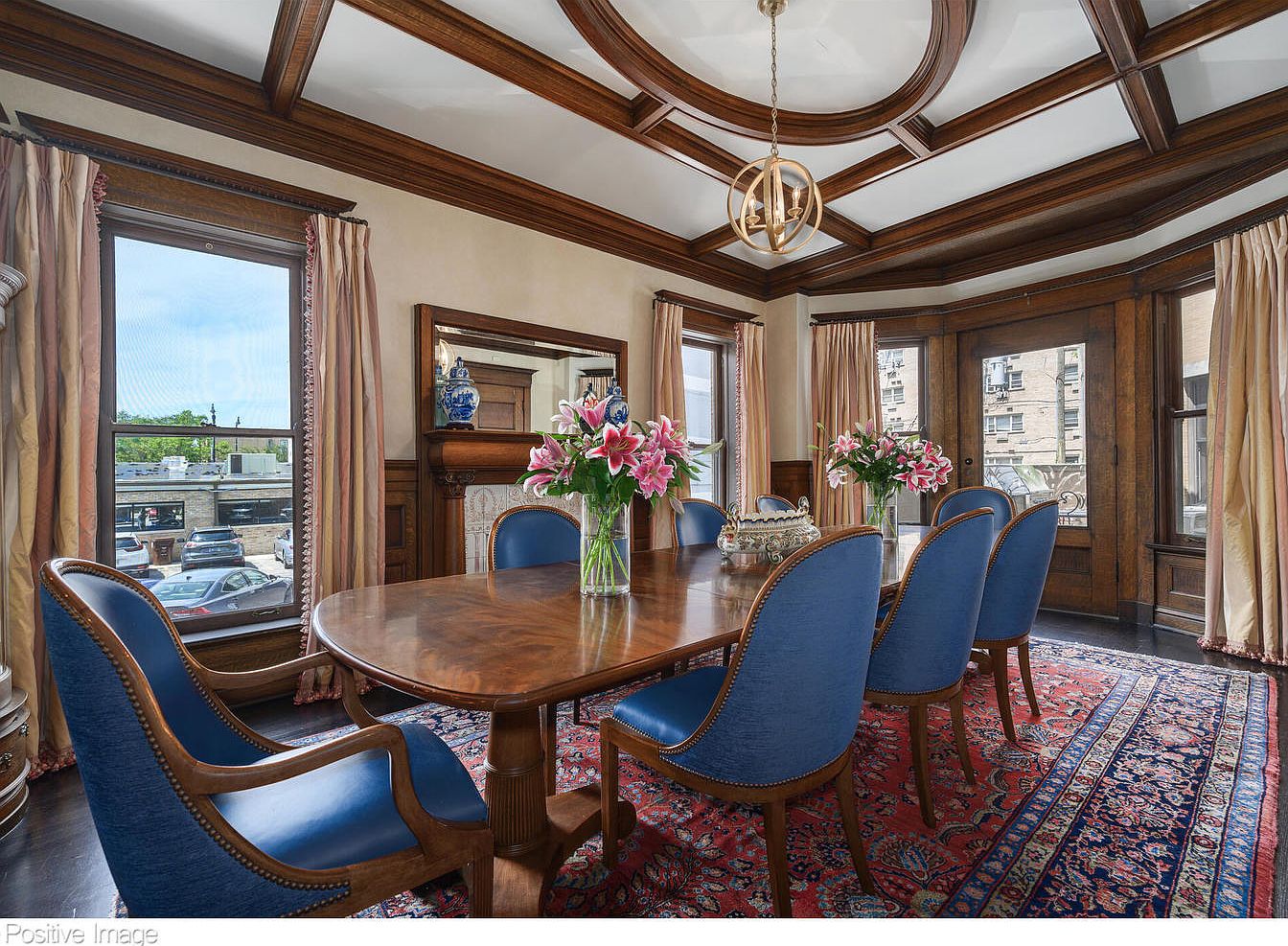 An elegant dining room featuring a large wooden oval table surrounded by six blue upholstered chairs with nailhead trim. Rich wood beams form intricate geometric patterns on the coffered ceiling, emphasizing the room’s historic character. The room receives abundant light from three tall windows and a glass-paneled door, all framed in dark wood and accented by blush-pink draperies. A detailed fireplace with a decorative tile surround anchors one wall beneath a wide wooden mantel and a large mirror. Floral arrangements add fresh color atop the table, which sits atop a vivid red and blue Persian-style rug.