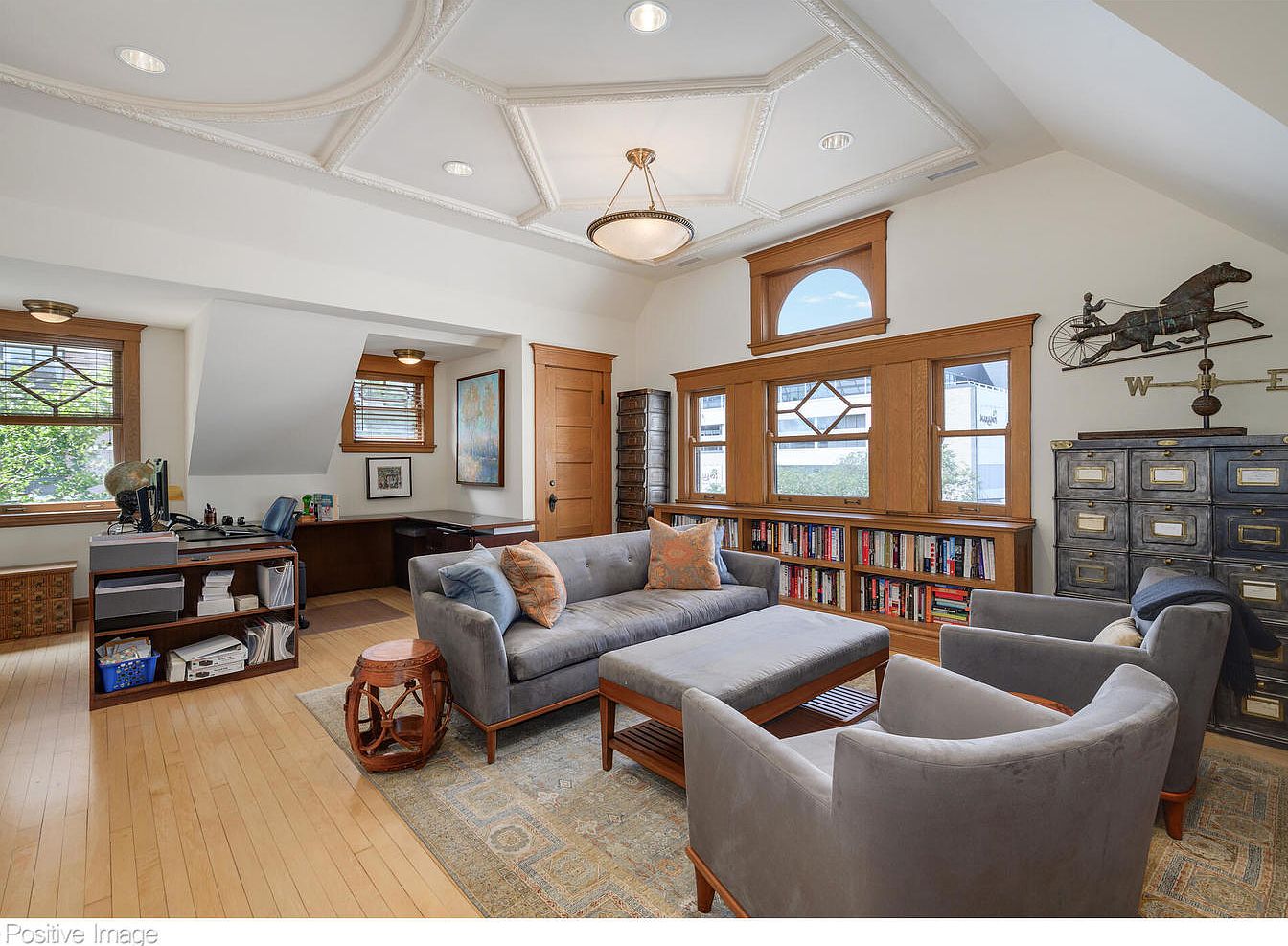 A spacious and well-lit room that combines a library, lounge, and office area. Pale hardwood floors add warmth, complemented by built-in wooden bookcases topped with divided light windows framed in rich wood trim. The seating area features a gray velvet sofa and matching armchairs, accented by soft-toned pillows, arranged around a rectangular ottoman atop an ornate rug. Decorative molding graces the high, tray ceiling, and a large pendant light fixture hangs centrally. One wall features vintage metal filing cabinets with a horse weather vane, while the nook houses a modern workstation with a desk and shelving, creating a cozy, functional retreat.