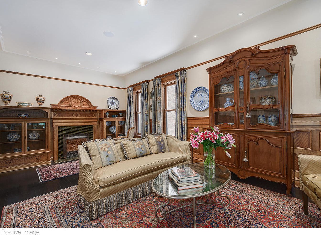 A traditional living room awash in warm tones, anchored by ornate wooden cabinetry and a decorative fireplace on one wall. Glass-fronted display cabinets and a tall china hutch showcase blue-and-white ceramics and fine dishware. A trio of windows framed by classic drapes lets in natural light, accentuating the intricate detailing on the carved woodwork. An upholstered beige sofa with tassel trim and embroidered throw pillows faces a glass-topped coffee table, which holds a vase of fresh pink lilies and stacked books. Rich, Persian-style rugs in shades of rust, navy, and cream cover the dark wood floor, adding warmth and texture.