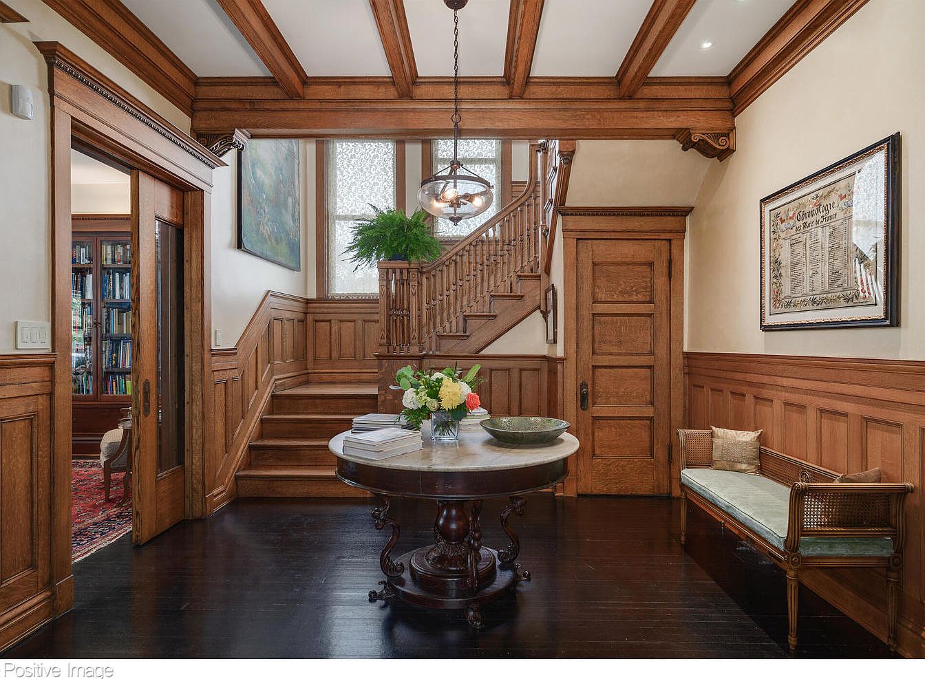 Warm wooden paneling and exposed ceiling beams create an inviting ambiance in this grand foyer. A stately staircase with elaborate railing rises along the back wall, anchoring the space. In the center sits a round, ornately carved table topped with a bouquet of fresh flowers and decorative trays. To the right, a light green upholstered bench, framed by matching woodwork, provides a welcoming spot to sit. Large windows with patterned glass bathe the area in natural light, while artwork and a decorative framed piece add interest to the cream-toned walls. Rich, dark hardwood floors complete the refined, historic look.