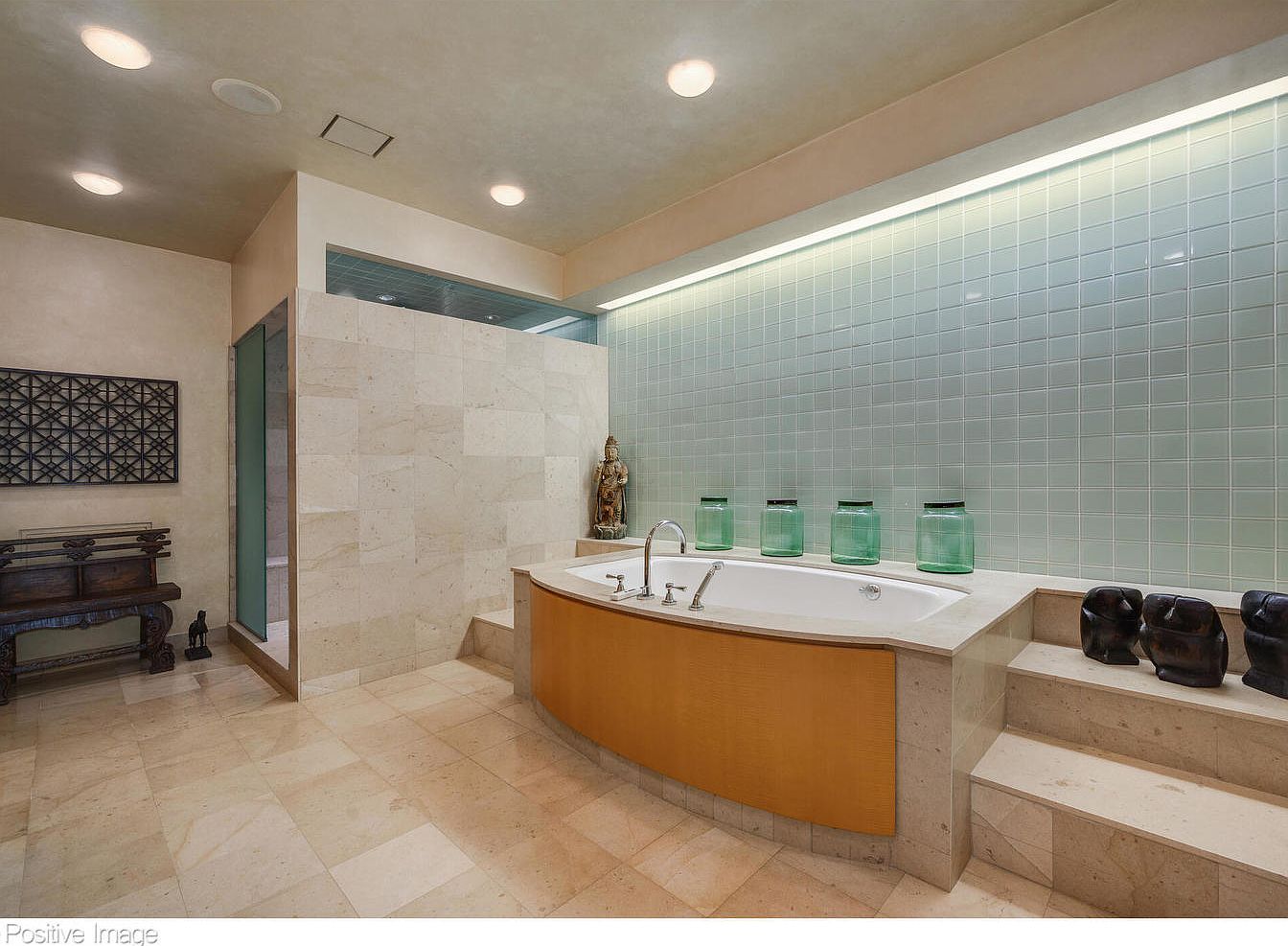 A spacious bathroom dominated by a deep soaking tub with a curved wood-tone front panel, set into stone tile. Steps lead up to the tub on the right, with three sculptural black stools placed nearby. The backdrop features a wall of pale aqua glass tiles, creating a calming, spa-like effect. On the tub deck are five green glass jars, with a statue resting in the corner, blending artistic and serene elements. Neutral stone tile covers the floor and lower walls, while a decorative wooden bench and geometric wall art add an Asian influence to the tranquil space.