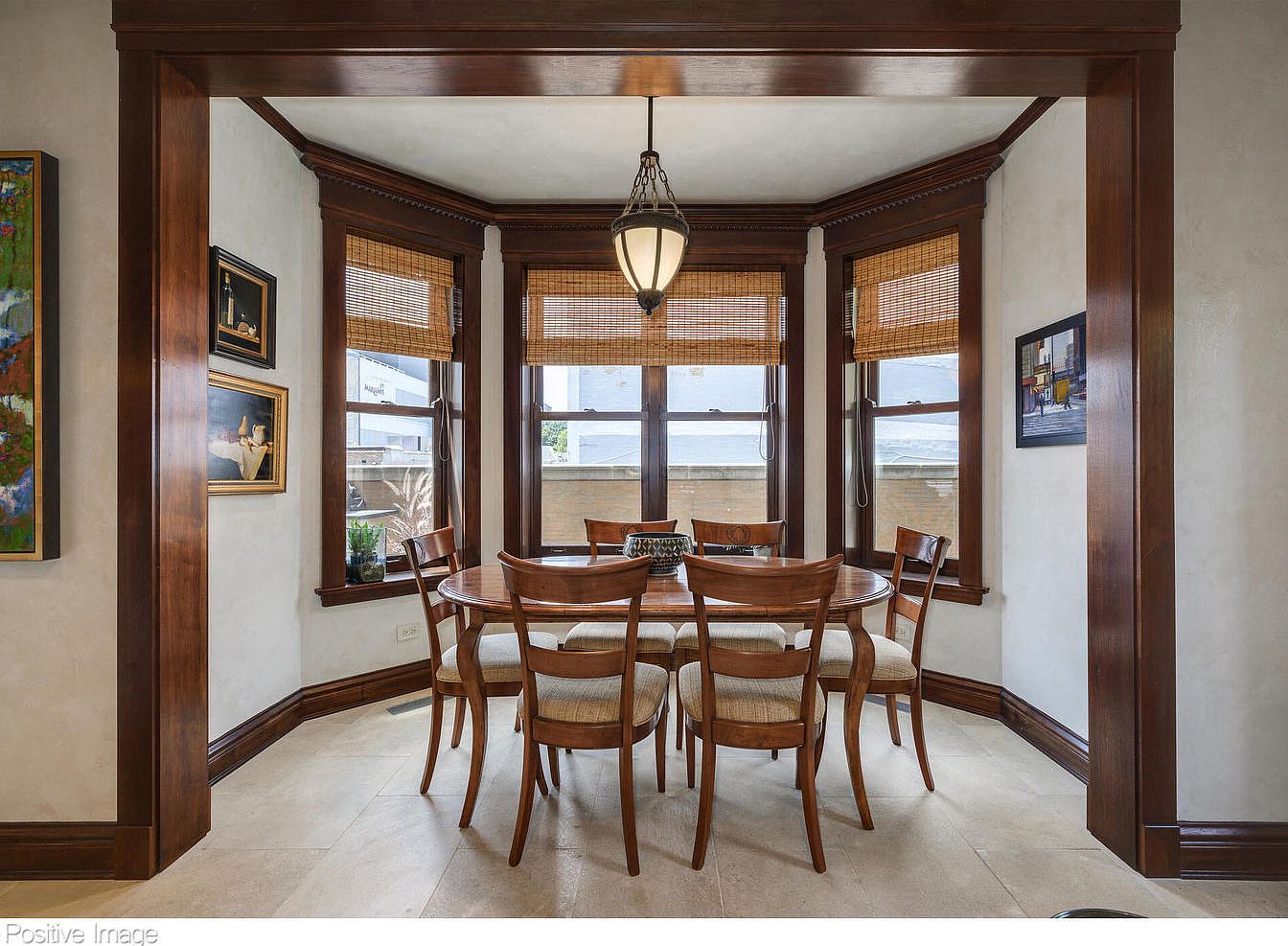 A cozy dining area features a round wooden table surrounded by six matching wooden chairs with cream-upholstered seats. Large bay windows with classic dark wood trim bring in natural light, softened by woven bamboo shades for privacy and warmth. The alcove is framed by substantial wooden moldings and a wide entryway, creating an inviting, semi-enclosed space. Neutral stone tile flooring grounds the room. The walls are adorned with a few framed artworks, adding character and a hint of color. Overhead, a vintage-style pendant light centers the table, lending a historic charm to the intimate setting.
