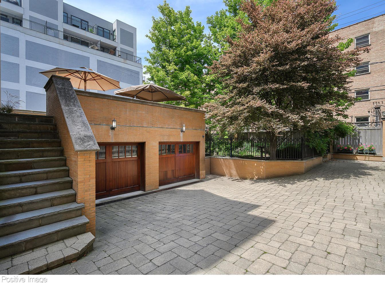 A spacious paved driveway leads to a two-car garage with warm wooden doors and divided light windows, set within a pale brick structure. On the left, a set of broad, stone-topped stairs ascends to a patio space above the garage, furnished with large beige umbrellas. The area is framed by mature trees, some with deep reddish foliage, and wrought iron fencing enclosing landscaped garden beds. Lantern-style wall sconces add subtle historic charm. The surrounding buildings create an urban backdrop, while the natural greenery softens the area, lending the space both privacy and elegance.
