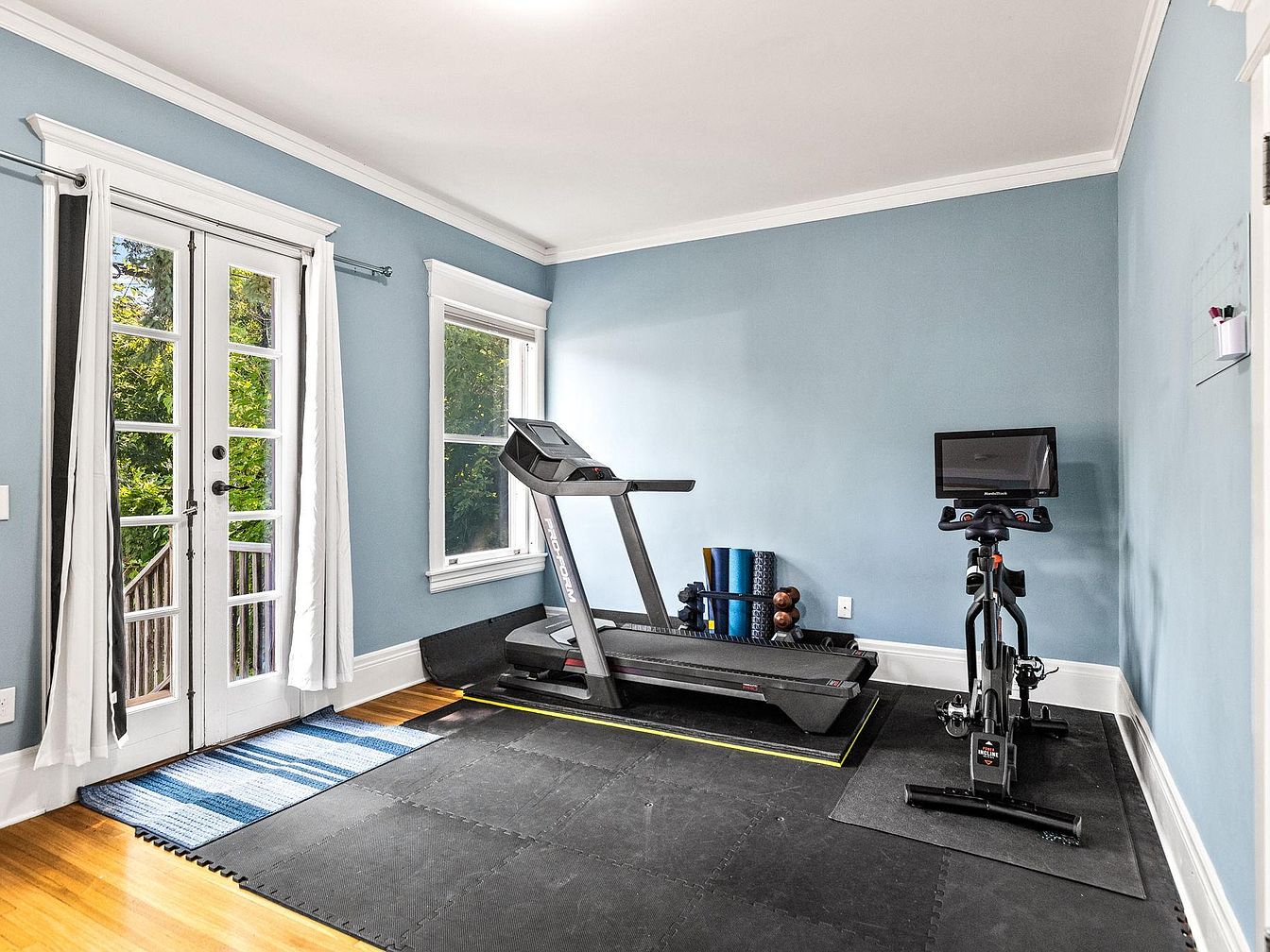 A small, dedicated home gym area painted in soft blue tones with crisp white trim and crown molding. The space features a treadmill and a stationary bike with a built-in screen, both placed on large interlocking black rubber mats to protect the hardwood floor. A set of yoga mats and foam rollers sit neatly in the corner. Natural light streams in through tall glass French doors and a large window with white curtains, offering a lush green view outside and creating an uplifting, airy atmosphere perfect for workouts.