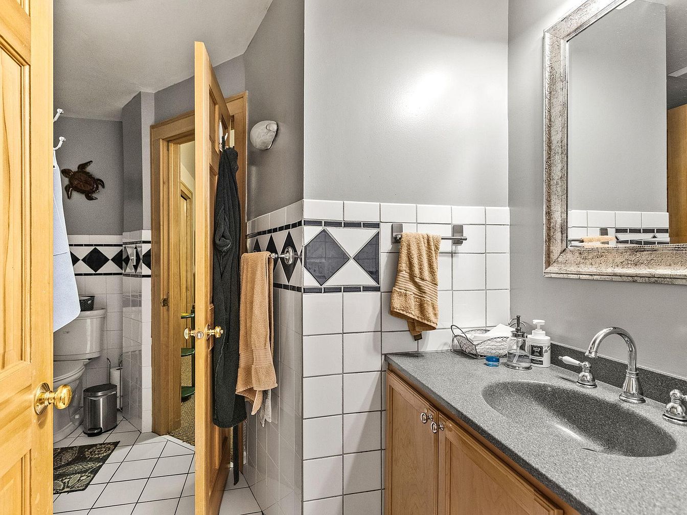 This bathroom features a sleek, modern design with light wood cabinetry below a gray stone countertop and an undermount sink. The countertops hold toiletries including a soap dispenser, tissues, and a small basket. A large, distressed silver-framed mirror hangs above the vanity, reflecting the soft, natural lighting. Walls are painted a cool gray, topped by glossy white tiles wainscoting, and bordered with a distinctive black and white diamond pattern. Warm wood doors with shiny brass knobs lead to the toilet area, partially visible with a small trash can, wall art, and neatly placed towels in beige and dark hues accenting the clean, tidy space.