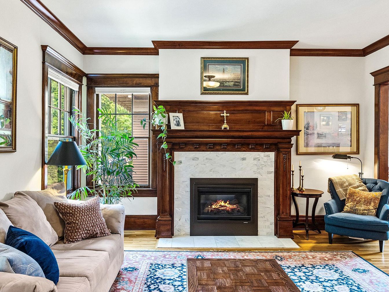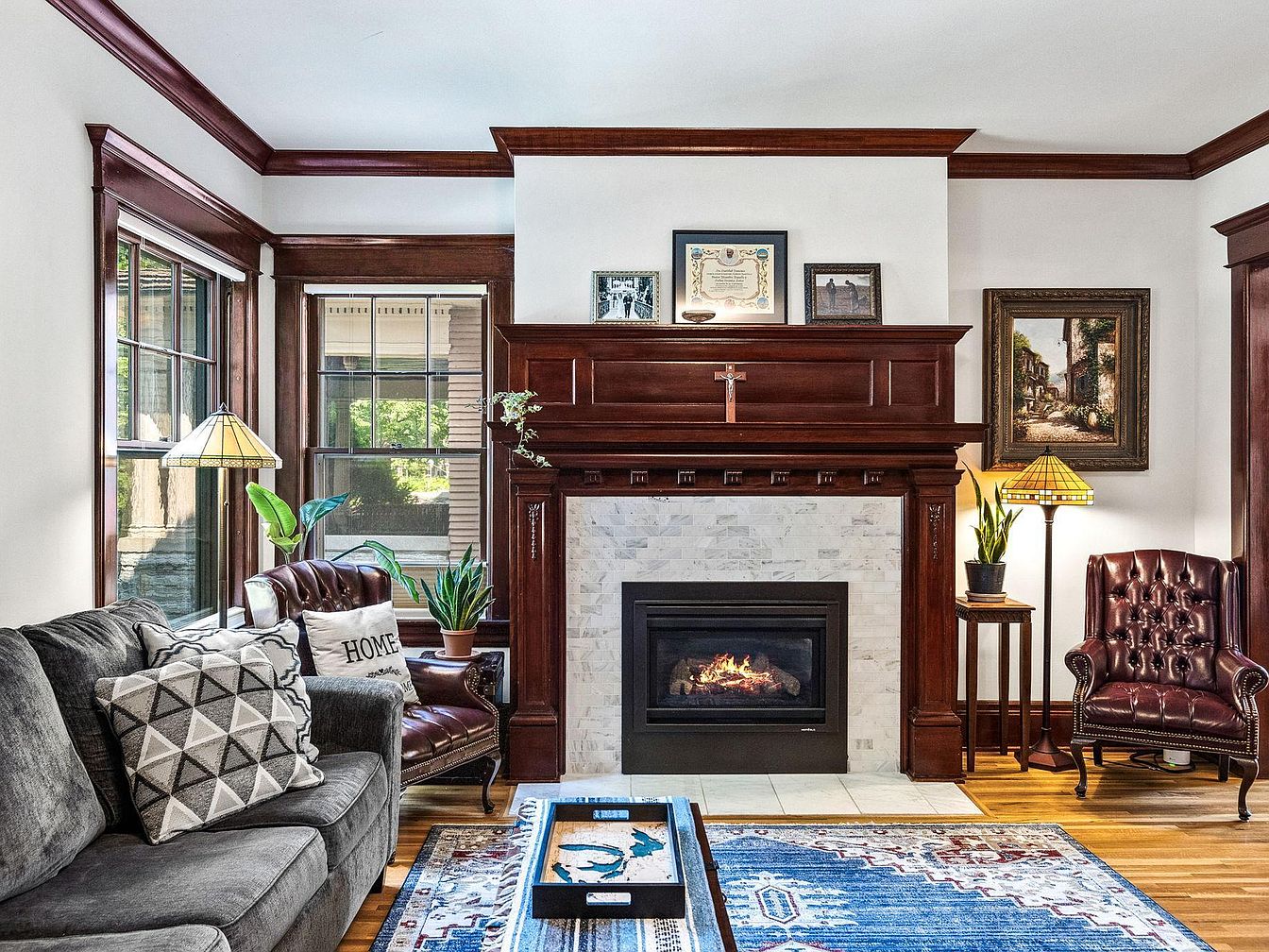 A cozy, historic living room centers around a stately fireplace with a white marble surround and deep, rich wood mantel. The walls are soft white, accented by mahogany-stained wood trim, molding, and window frames, exuding classic American charm. Two elegant burgundy leather armchairs flank either side of the fireplace while a dark gray upholstered sofa sits to the left, adorned with decorative patterned pillows. Vintage-style lamps with stained-glass shades provide warm ambient lighting. Touches of greenery from potted plants add life to the space, accompanied by framed artwork and certificates above the mantel, which complete the traditional, welcoming aesthetic.