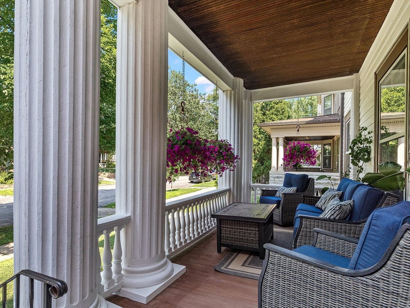 A classic front porch featuring tall, fluted white columns with ornate bases, providing a grand and stately look. The porch ceiling is made of rich wood, adding warmth and historic charm. Comfortable wicker armchairs with deep blue cushions and striped throw pillows are arranged around a square wicker coffee table on a small rug. Hanging baskets of vibrant purple flowers add lively bursts of color, while potted green plants rest on the floor. The porch is partially enclosed by a traditional white balustrade, offering a peaceful sitting area with views of a tree-lined street and neighboring historic homes.
