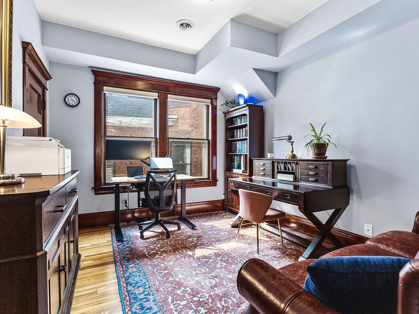 A spacious home study featuring large windows framed with rich dark wood trim, letting in ample natural light that illuminates the room. Pale blue-gray walls enhance the sense of calm, complementing the intricate red and blue patterned rug covering polished hardwood floors. A classic wooden desk with vintage brass lamp and potted plant sits against one wall, while another work area with a minimalist black chair and monitor faces the windows. Built-in bookshelves are filled with volumes, and a brown leather sofa with a deep blue cushion adds comfort, creating a blend of historic warmth and practical functionality.