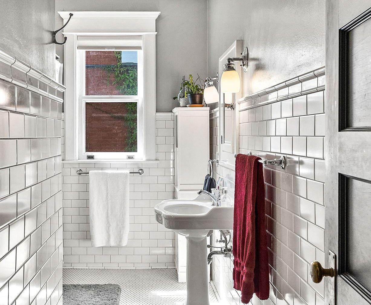 Narrow bathroom with a vintage aesthetic, featuring glossy white subway tiles that extend halfway up the walls, capped with a trim tile. The upper walls are painted a soft gray, complementing the clean, classic look. Freestanding pedestal sink sits beneath a rectangular wall mirror, flanked by two chrome and glass sconces. A maroon towel hangs from a chrome rod on the right, while a white towel is positioned beneath a window with white wood trim. Natural light floods in, highlighting a white storage cabinet topped with a plant. White hexagonal floor tiles add to the timeless, airy atmosphere.