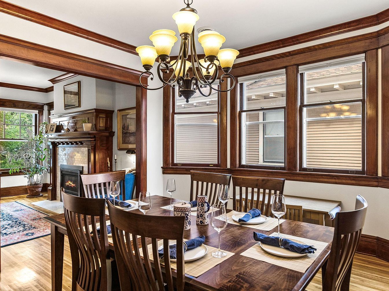 A classic dining room with rich wooden trim and molding, exuding early 20th-century charm. The centerpiece is a dark wood dining table set for six, each place with a white plate, blue napkin, and large wine glass on a cream placemat. An ornate chandelier with soft yellow glass shades hangs above. Three large windows allow ample natural light, highlighting the warm wood tones throughout. The adjacent room features a fireplace with a carved wood mantel, framed paintings, and a large indoor plant, while a blue-patterned rug decorates the living area, creating a cohesive, welcoming space.