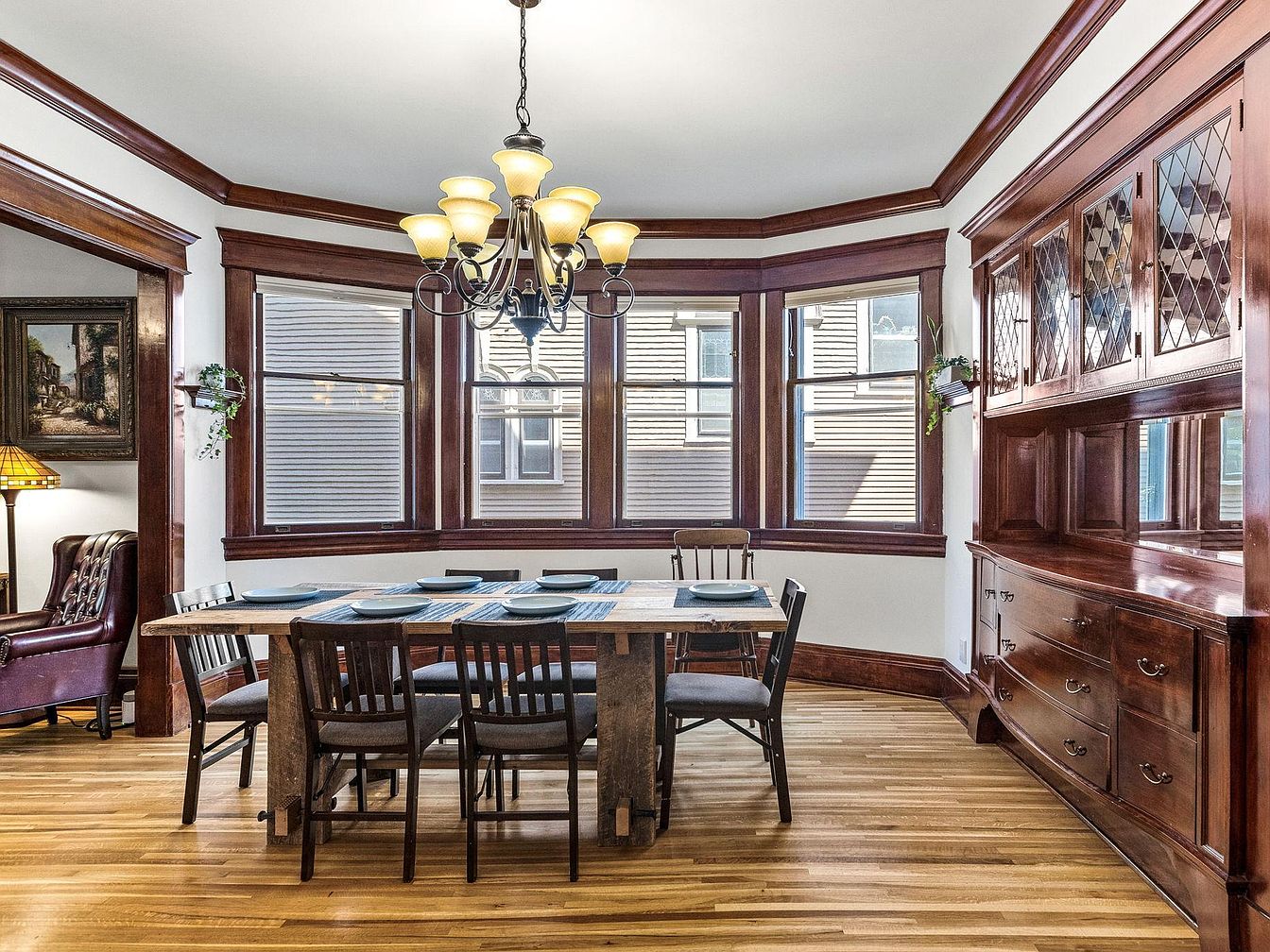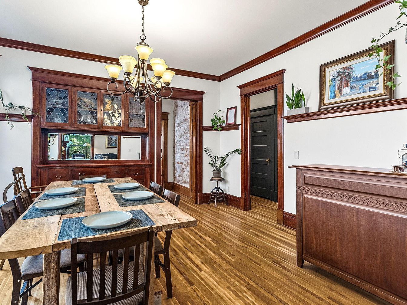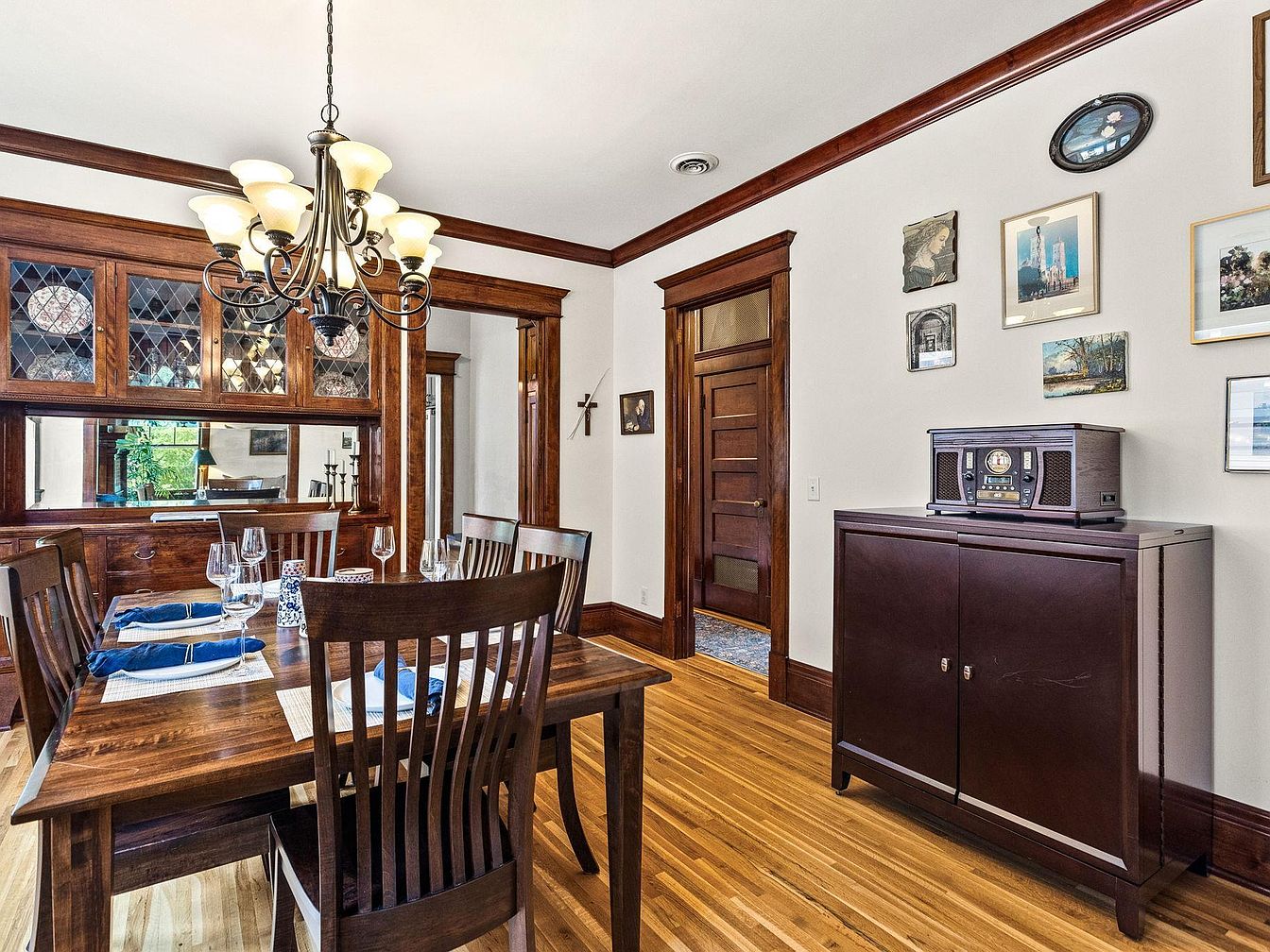 A classic dining room furnished with a rich wooden dining table and matching chairs, set with placemats, blue napkins, and glassware for a formal meal. Warm, honey-toned hardwood floors span the space, complemented by substantial dark-stained wooden trim and crown moldings. On one wall, a built-in glass-fronted cabinet displays delicate china and includes a mirrored back. Artwork and framed photographs are arranged gallery-style on pale walls, and a vintage-style radio sits atop a sleek dark sideboard. A wrought iron chandelier with frosted glass shades casts soft, inviting light, enhancing the room’s vintage yet welcoming ambiance.
