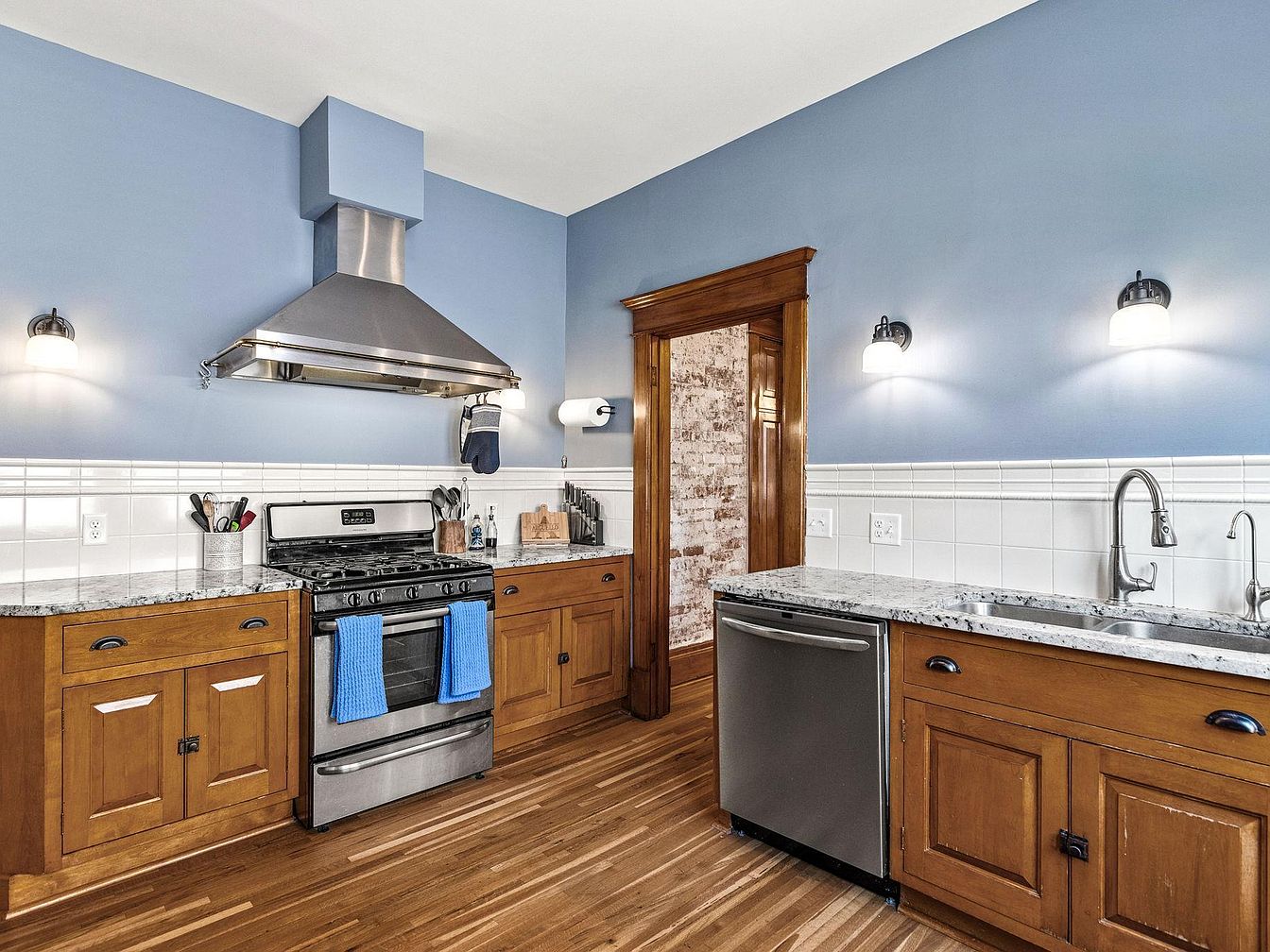 A spacious kitchen features warm wooden cabinetry with black hardware and a polished gray stone countertop. Stainless steel appliances, including a gas stove and modern dishwasher, provide a sleek contrast. Above the stove hangs a large, angular stainless steel range hood. The backsplash consists of glossy white tiles running halfway up the wall, meeting a pastel blue painted section above. Four wall-mounted glass sconces provide soft, even lighting. A wide wooden doorway leads to another space with exposed brick walls, adding historic character. The floors are a rich, honey-colored hardwood, contributing to the cozy yet polished atmosphere.