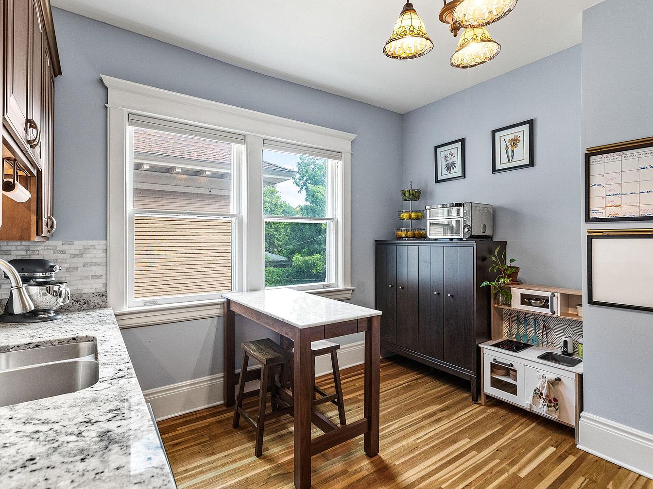 A cozy breakfast nook in a kitchen filled with natural light from large double windows. The space features soft blue-gray walls and white trim, creating a fresh, inviting ambiance. A marble countertop runs along the left side, complemented by light wood cabinetry. The eating area includes a compact wooden table and two stools, positioned in front of the windows. Across the room, a sleek black cabinet supports a toaster oven, flanked by wall art featuring botanical prints. A whimsical children’s play kitchen sits to the right, adding charm and personality. The hardwood floors add warmth and anchor the space’s classic, bright feel.