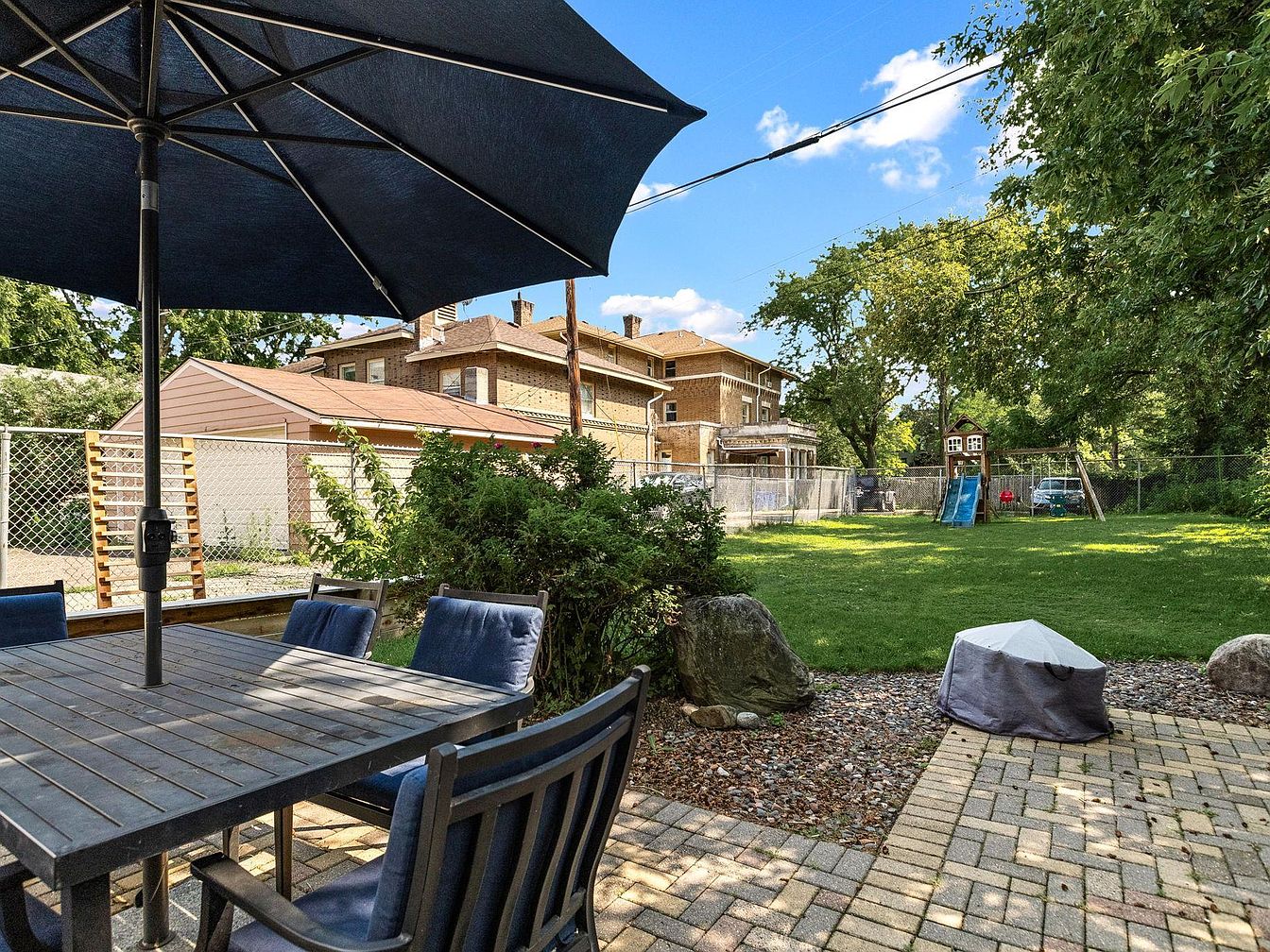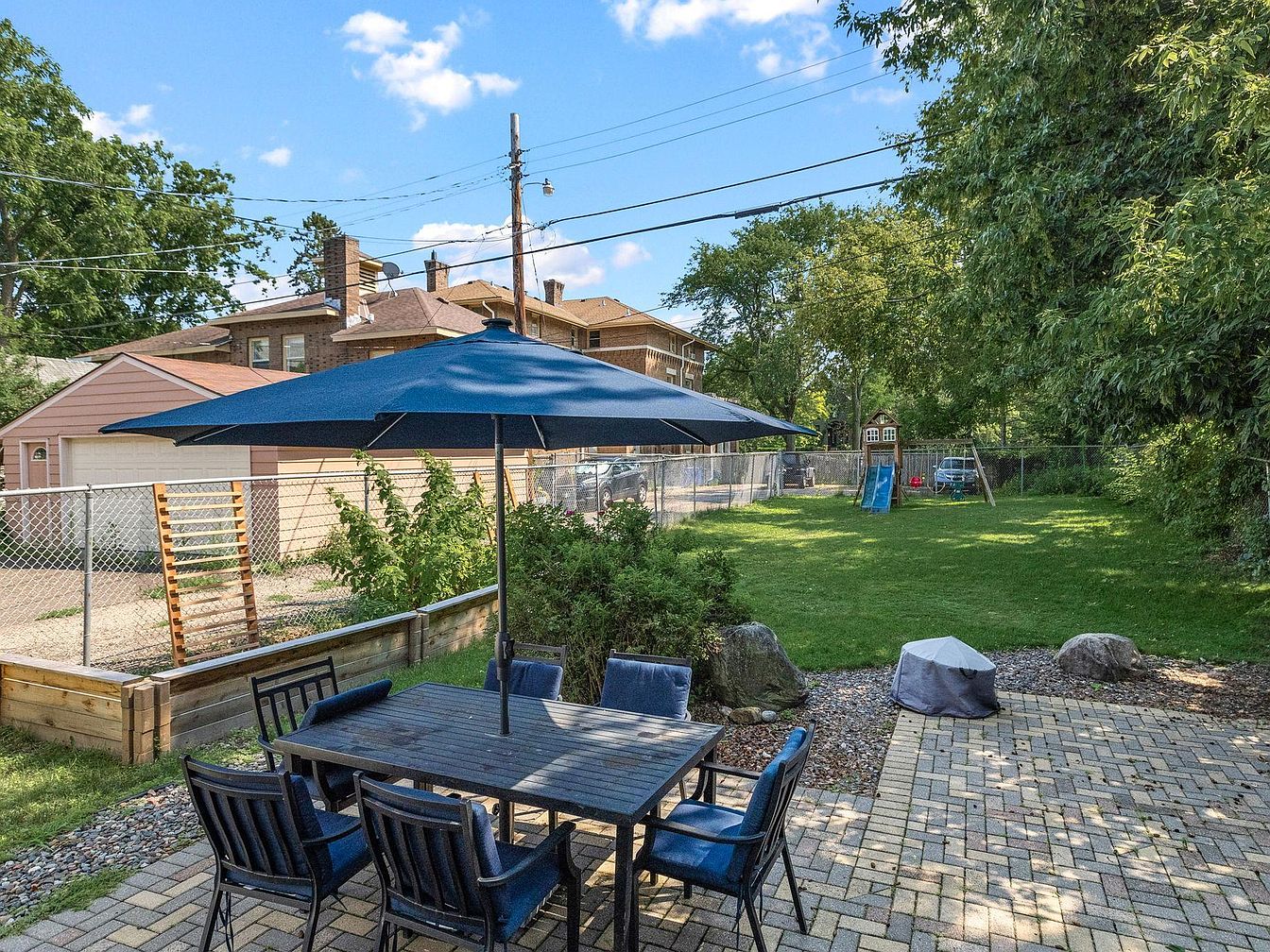 A spacious backyard features a paved patio area with a dark wooden table and six cushioned chairs, shaded by a large navy-blue umbrella. The patio is bordered by low wooden planters filled with greenery and small stones, adding a natural touch to the setting. Beyond the patio, the lawn stretches out with mature trees offering additional shade, while a children’s playset with a slide sits at the back corner of the yard. Chain-link fences mark the property line, and a detached pinkish garage is visible on one side, contributing to the neighborhood’s historic, residential charm.