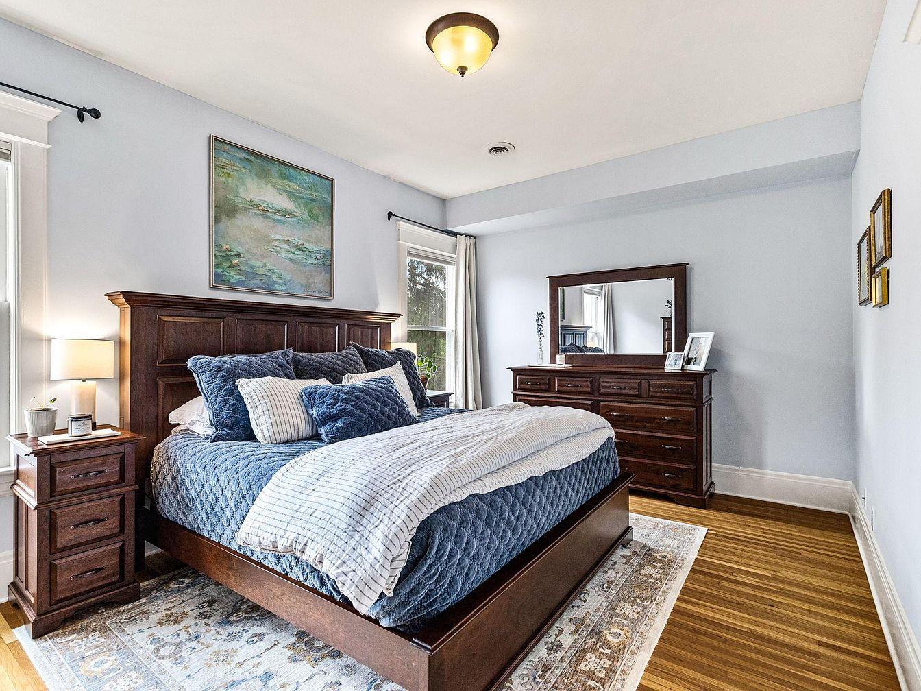 Spacious bedroom featuring a large wooden bed with a tall, paneled headboard set against pale blue-gray walls. The bed is adorned with a textured navy blue comforter and plush pillows in shades of blue and white. On one side of the bed, a matching wooden nightstand holds a small table lamp and decor. The opposite wall hosts a sturdy wooden dresser with a wide mirror above it, displaying framed photos and simple accessories. Natural light flows in through tall windows draped in light curtains, illuminating the warm wood flooring and a soft, patterned area rug beneath the bed for added comfort.