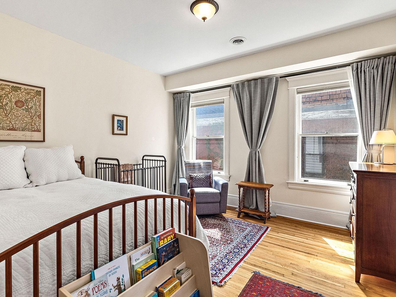 A serene bedroom corner features light cream walls and a spacious layout filled with natural light from two large windows adorned with soft gray drapes. A wooden spindle bed with crisp white bedding anchors the space, complemented by a cozy reading nook with a cushioned gray armchair and a wooden side table. Next to the bed is a wooden crib, and a bookshelf brimming with colorful children’s books adds a family-friendly touch. The hardwood floors are decorated with rich, patterned rugs that evoke warmth and history, while framed art and a wooden dresser with a lamp complete the cozy, welcoming ambiance.