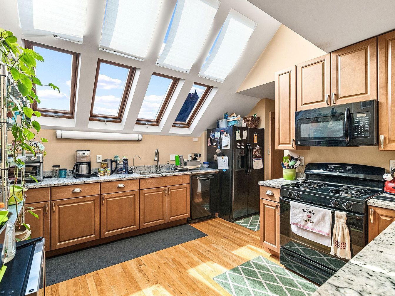 A bright kitchen filled with natural light from a row of large, slanted skylights set into the vaulted ceiling. Warm wood cabinetry lines the walls, paired with speckled granite countertops. Black appliances, including a refrigerator, stove, and microwave, create a sleek contrast. Greenery adds a fresh touch, with a trailing plant on the left. Wooden flooring enhances the cozy feel, and two green-and-white patterned rugs provide comfort underfoot. The space is organized with small kitchen appliances, utensils, and magnets on the fridge, giving a lived-in yet tidy atmosphere. Light tan walls complement the overall warmth and contemporary style.