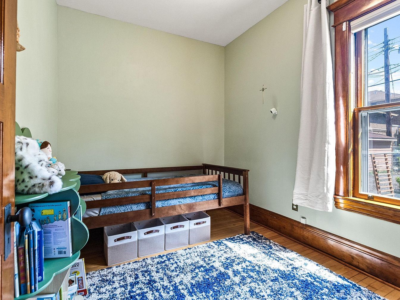 A small, cozy bedroom with soft light green walls and a wood-framed twin bed placed against the corner. A blue and white patterned rug covers most of the hardwood floor, adding warmth and texture to the space. Under the bed, four beige fabric storage bins help keep the room tidy. A round bookshelf filled with plush toys, books, and stuffed animals sits to the left, while a single curtain, drawn to the side, frames a large window with dark wood trim. Minimal decorations and light colors create a calm, inviting atmosphere, ideal for a young child.