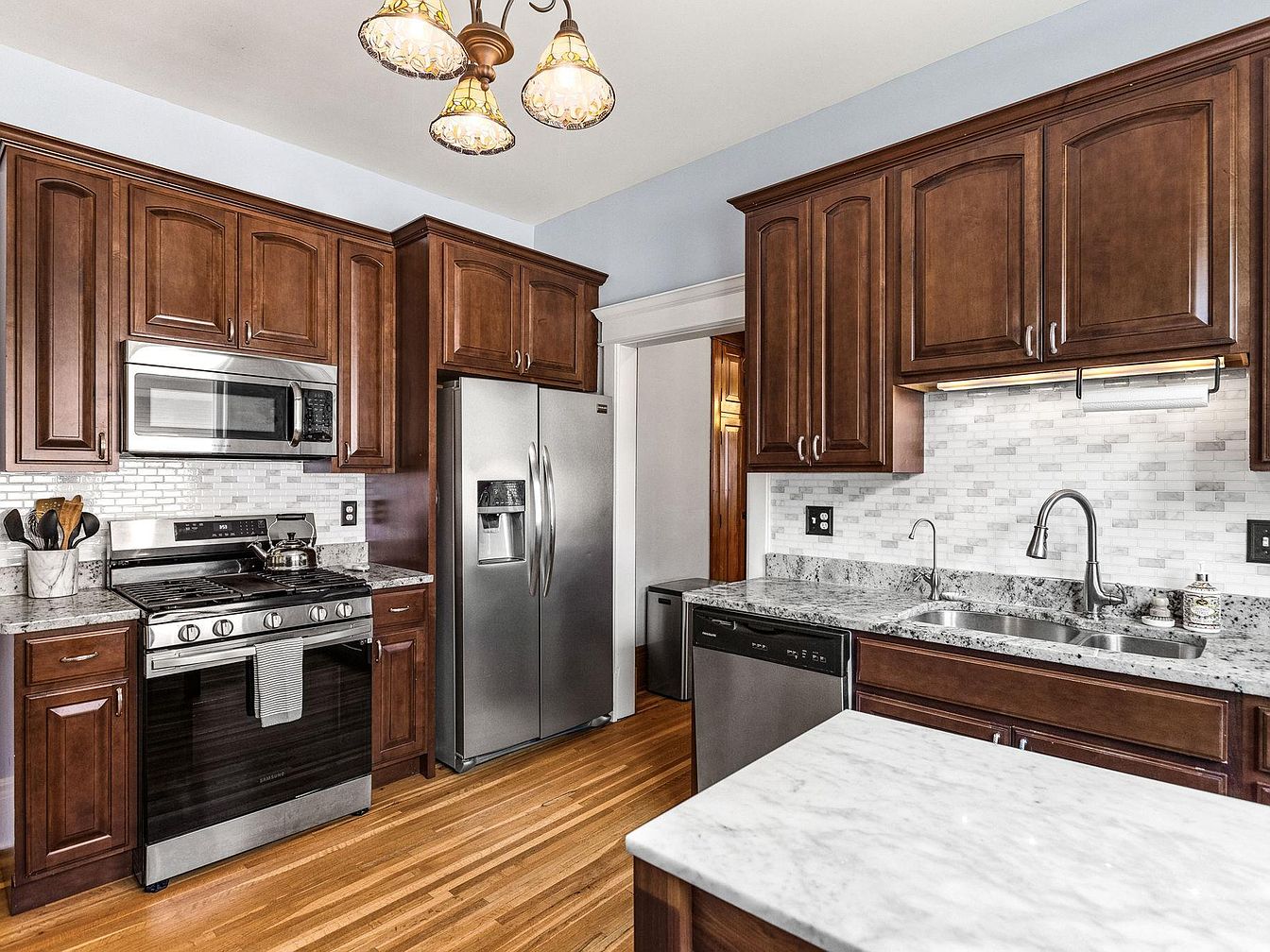 Warm wooden cabinets with rich brown tones line the walls above and below granite countertops, creating a sense of traditional elegance. The backsplash features a subtle white and gray marble tile, adding a touch of modern sophistication. Stainless steel appliances, including a refrigerator, gas stove, microwave, and dishwasher, offer a sleek contemporary feel. A large double sink is set beneath the cabinets, while a central marble-topped island provides additional workspace. The light fixture consists of three ornate glass lamps with brass fittings, imparting a historic charm that complements the warm wood. Natural-toned hardwood floors run throughout, adding inviting warmth to the space.